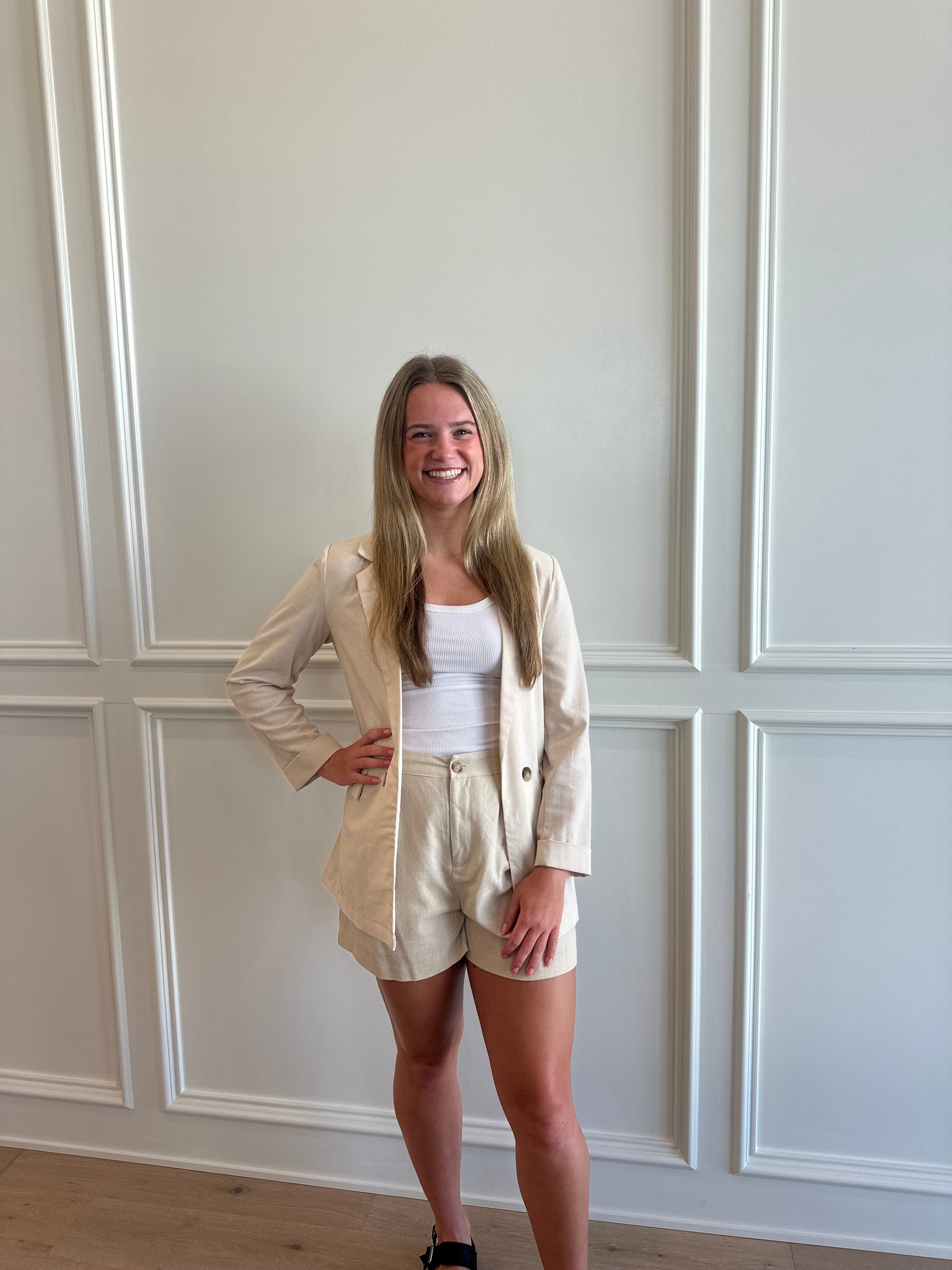 LARGE NOTCH COLLARED 3/4 SLEEVE / LONG SLEEVE CUFF SLEEVE LONG LINE SHOULDER PADS POCKET TAB BUTTON FRONT SOLID BLAZER NOT LINED 40%POLYESTER 30%RAY0N 20%COTTON 10%LlNEN