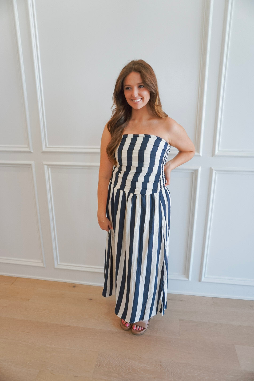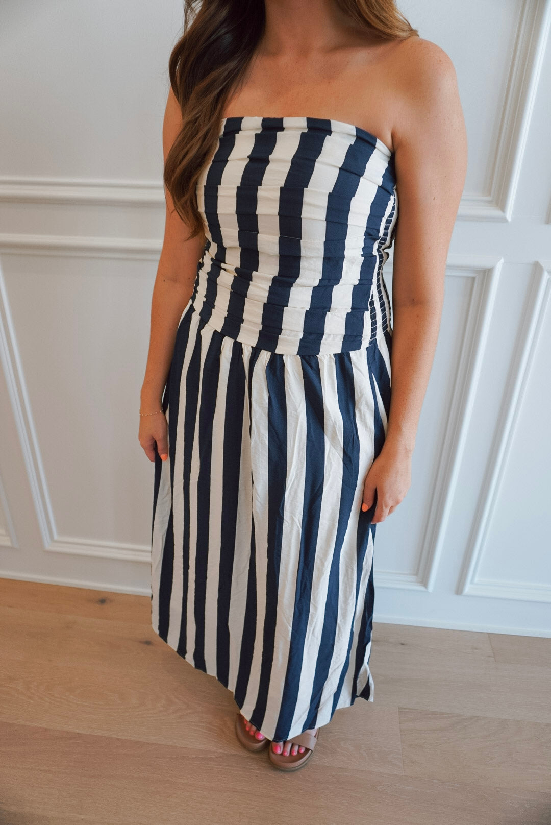 Anchor Up Vertical Stripe Drop Waist Strapless Midi Dress - Navy
