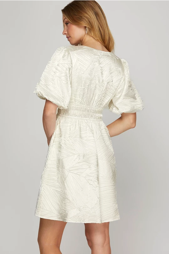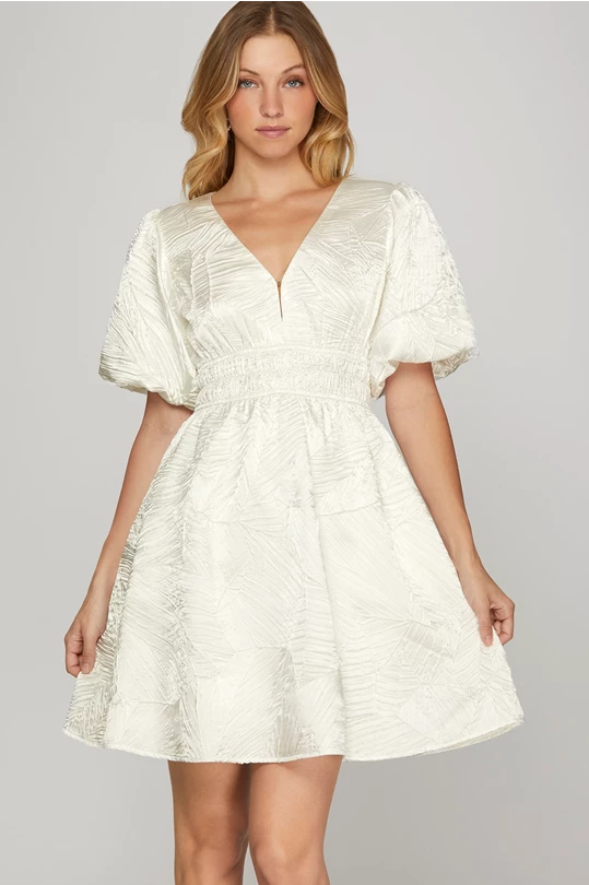 Get ready to turn heads with the Gracie Dress! Featuring playful puff sleeves and a unique crinkle woven design, this dress will make you stand out at any event. And with a convenient button clasp on the back, it's the perfect choice for brides or grads. Be the center of attention with the Gracie Dress!