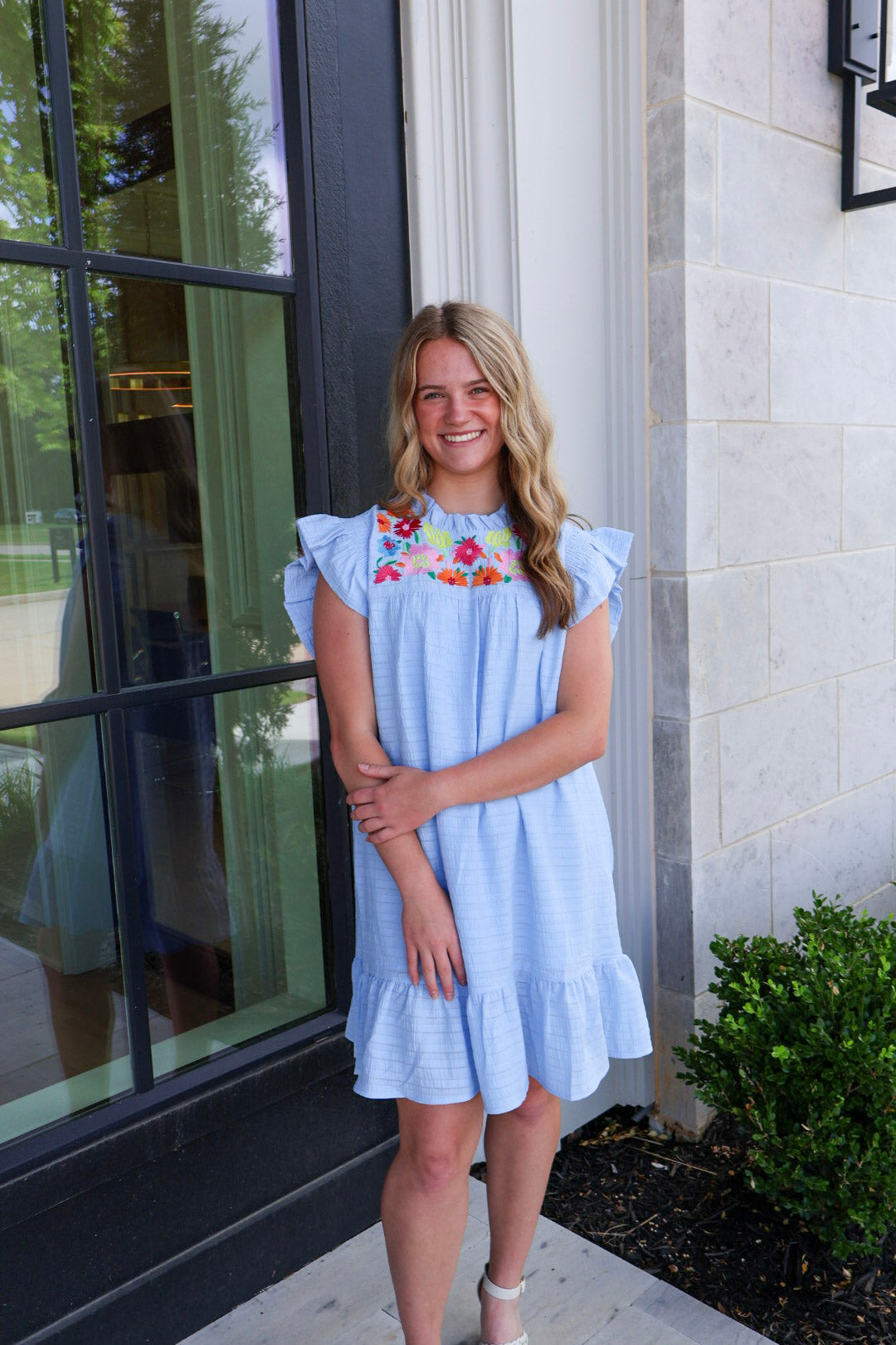 Textured dress with frilled neck, embroidered yoke, back key hole, ruffly trimming shoulder, side pockets, and ruffly hemline.
