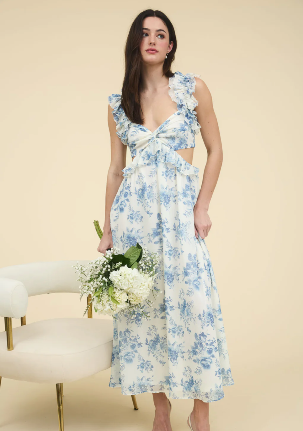 SWEETHEART NECKLINE TWIST BUST DETAIL SLEEVELESS BACK SMOCKING BACK CROSS SELF TIE RUFFLE STRAPS RUFFLE DETAIL SIDE CUT-OUT FLORAL PATTERN LINED MIDI DRESS SHELL: 100% POLYESTER LINING: 100% POLYESTER
