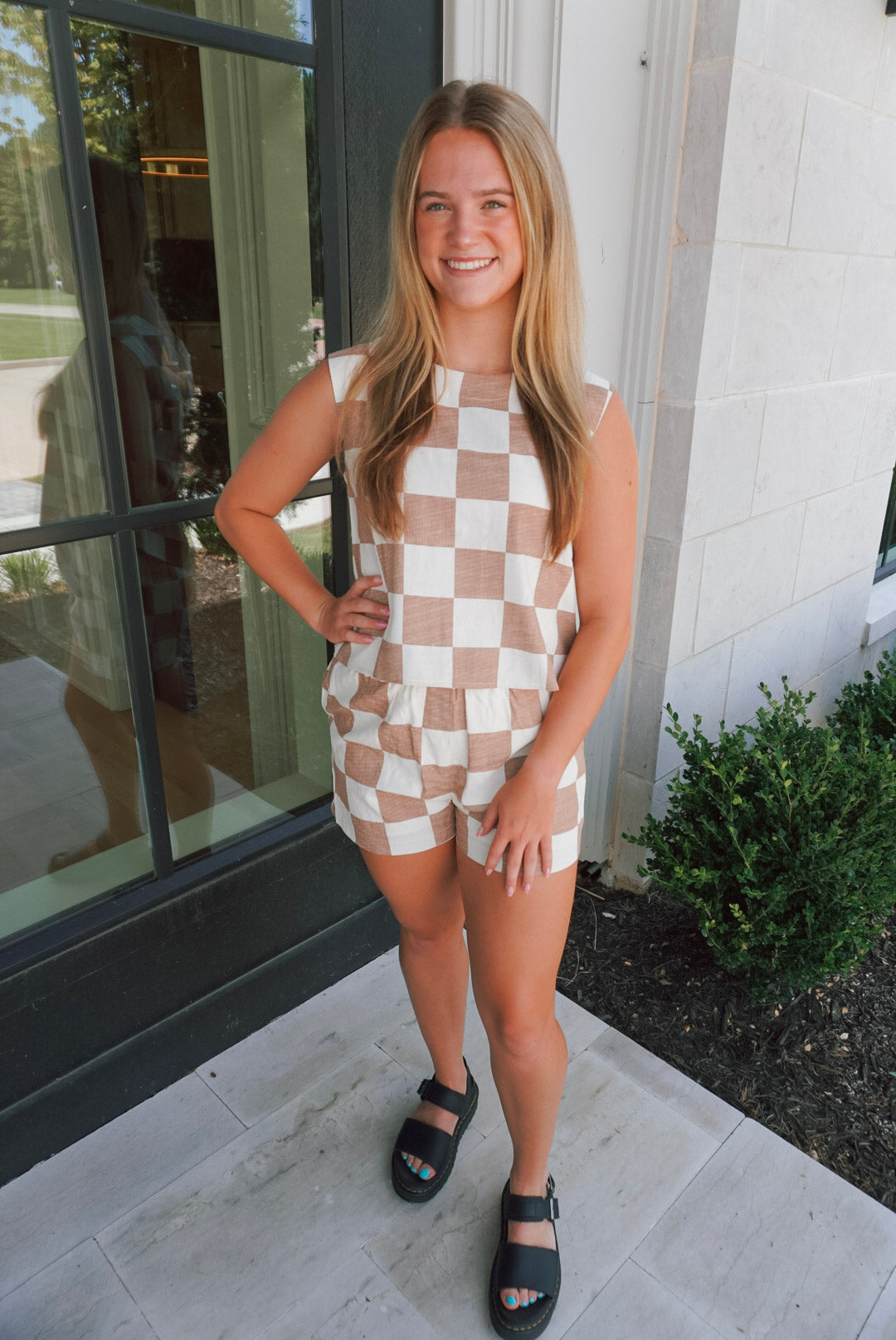 ROUND NECKLINE SLEEVELESS BACK BUTTON CLOSURE CROPPED CHECKERED LINEN TOP WOVEN TOP CROPPED 80% RAYON, 15% LINEN, 5% COTTON