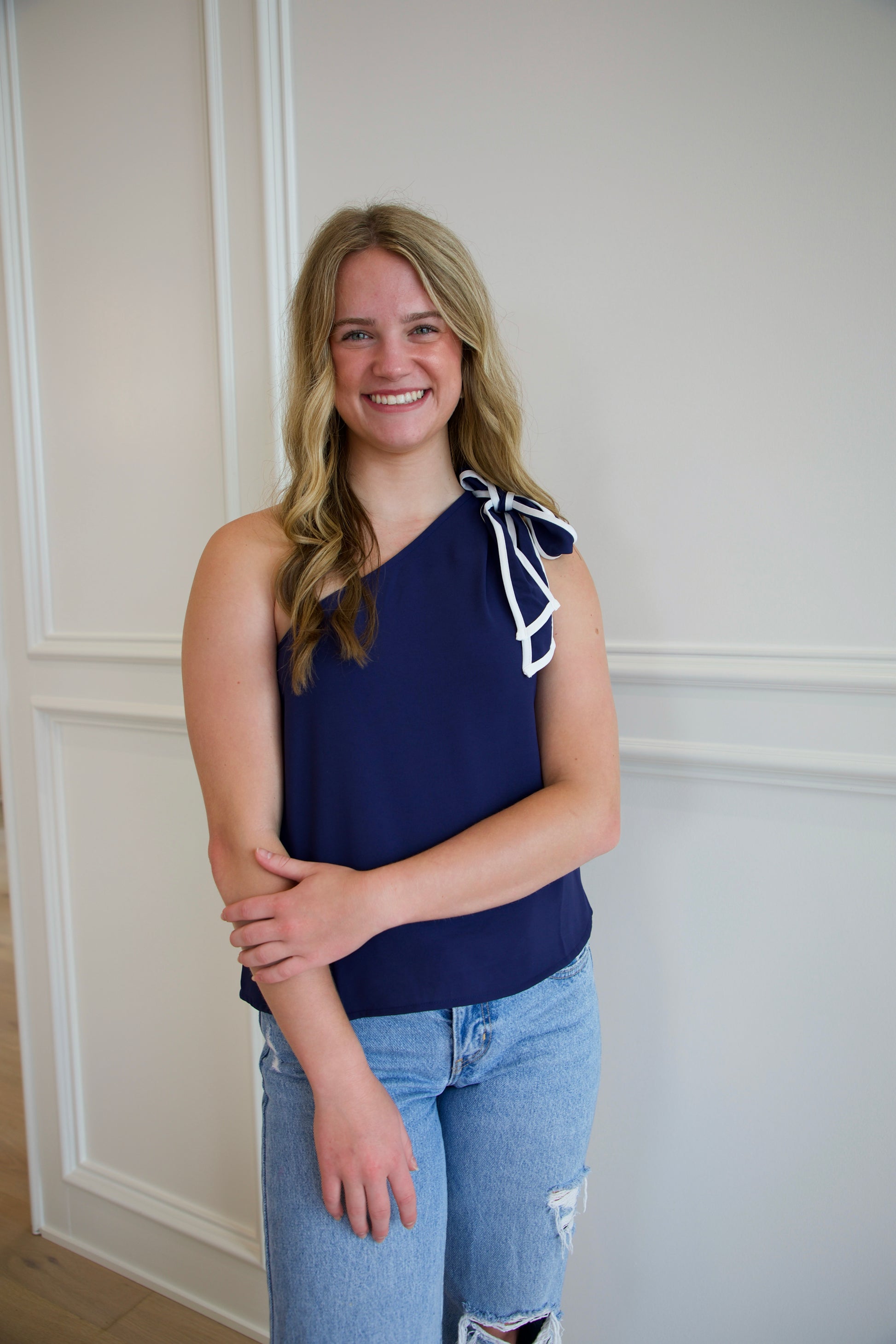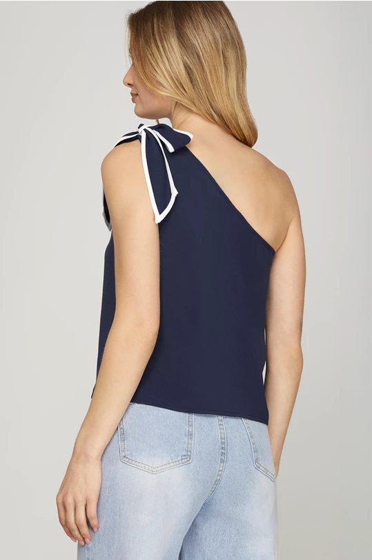 ONE SHOULDER WOVEN TOP WITH CONTRAST EDGE BINDING SHOULDER BOW TIE
