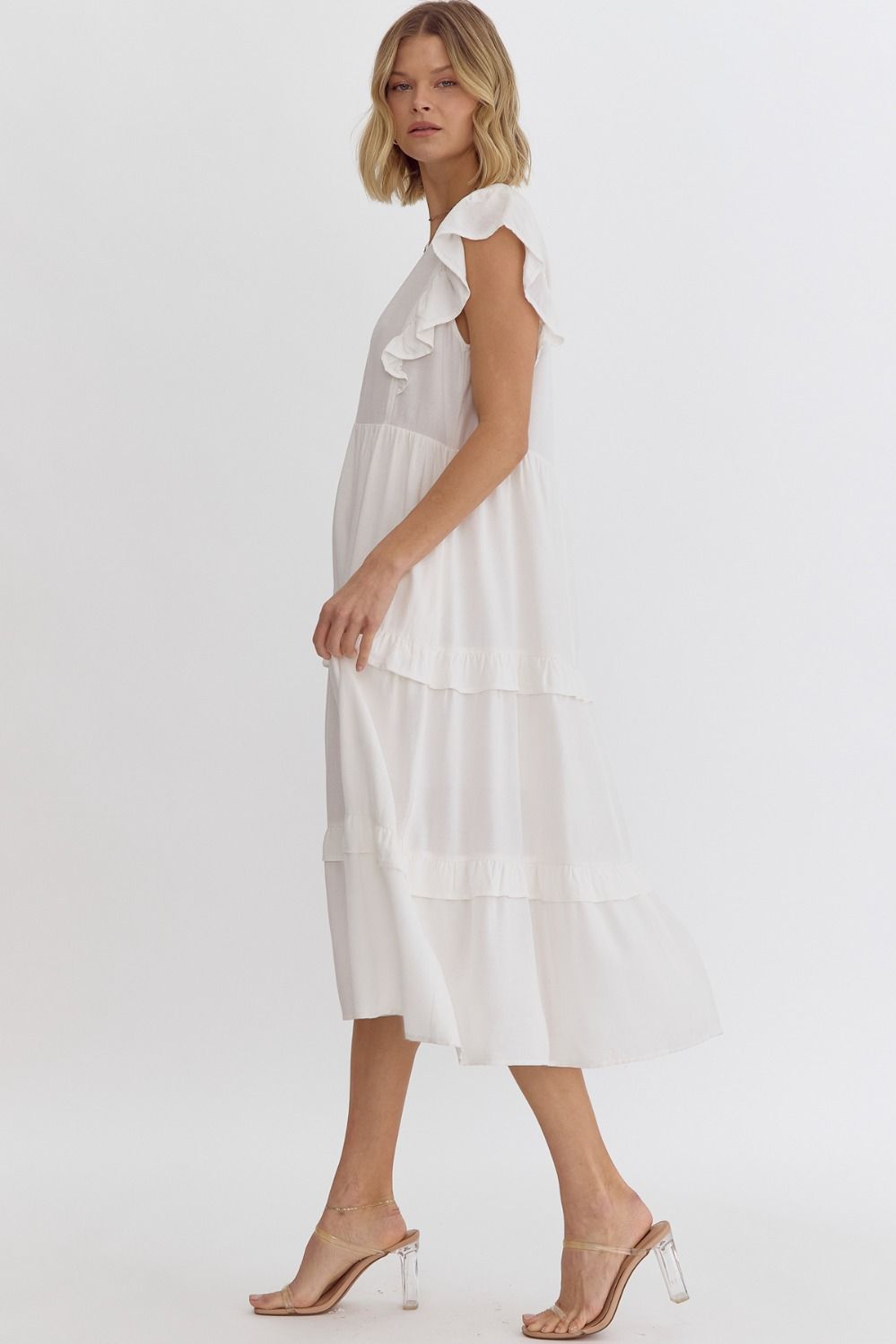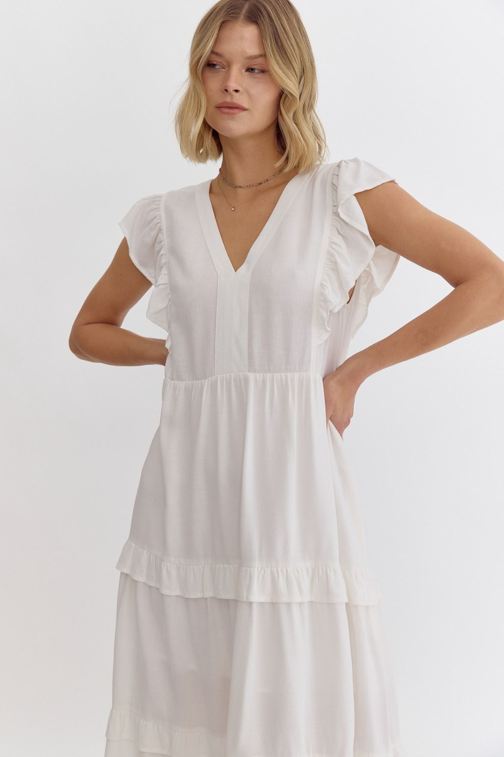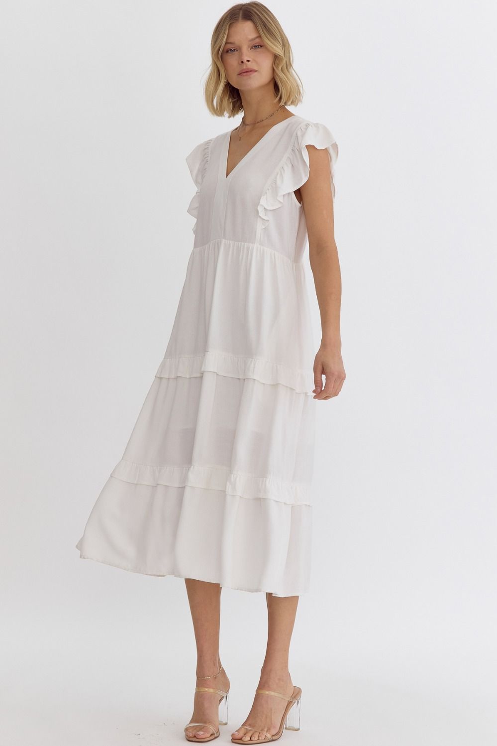 V-neck ruffle sleeve tiered midi dress. Pockets at side. Lined. Woven. Non-sheer. Lightweight.