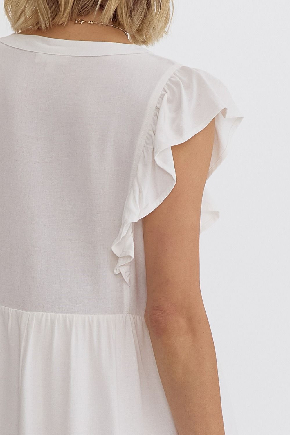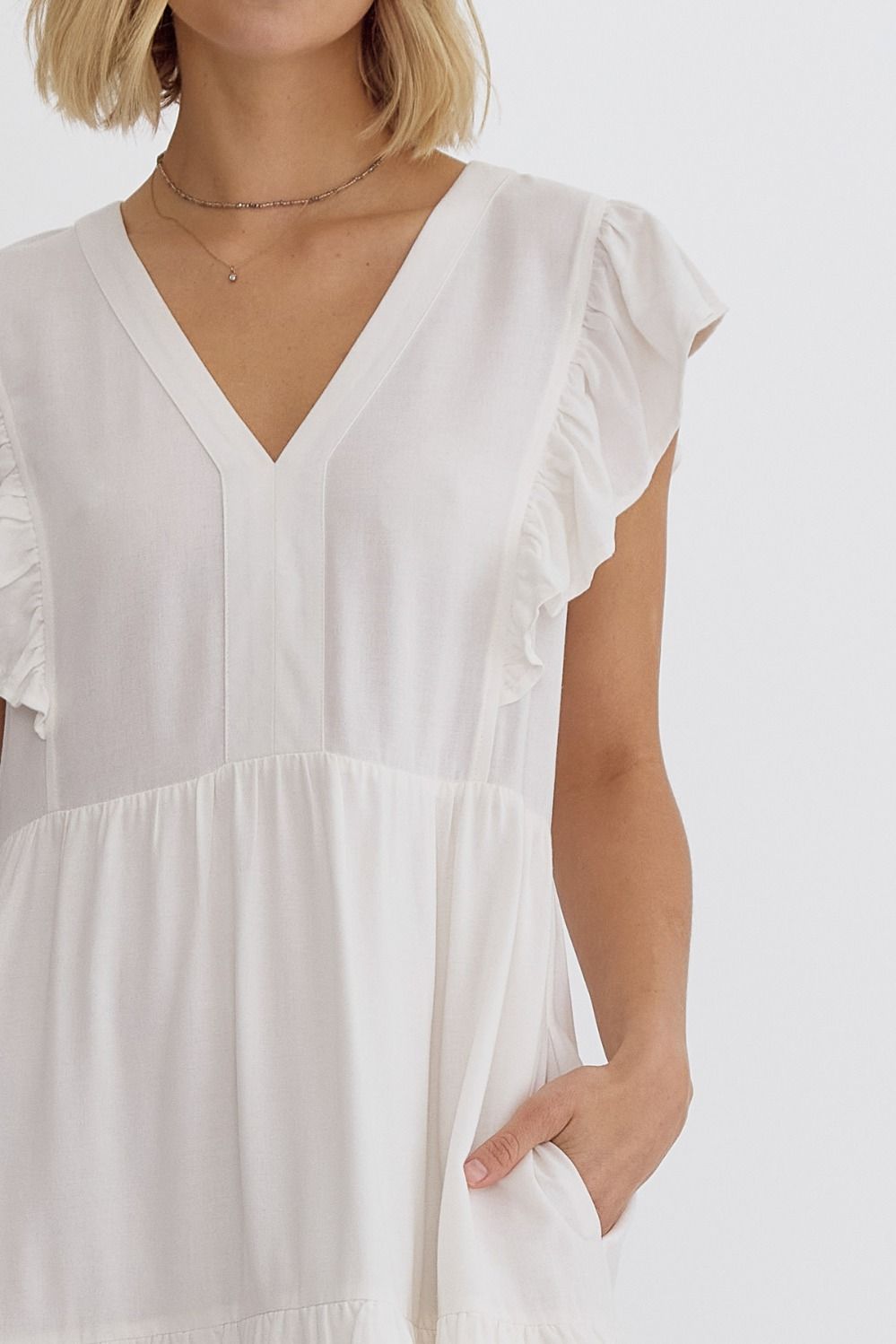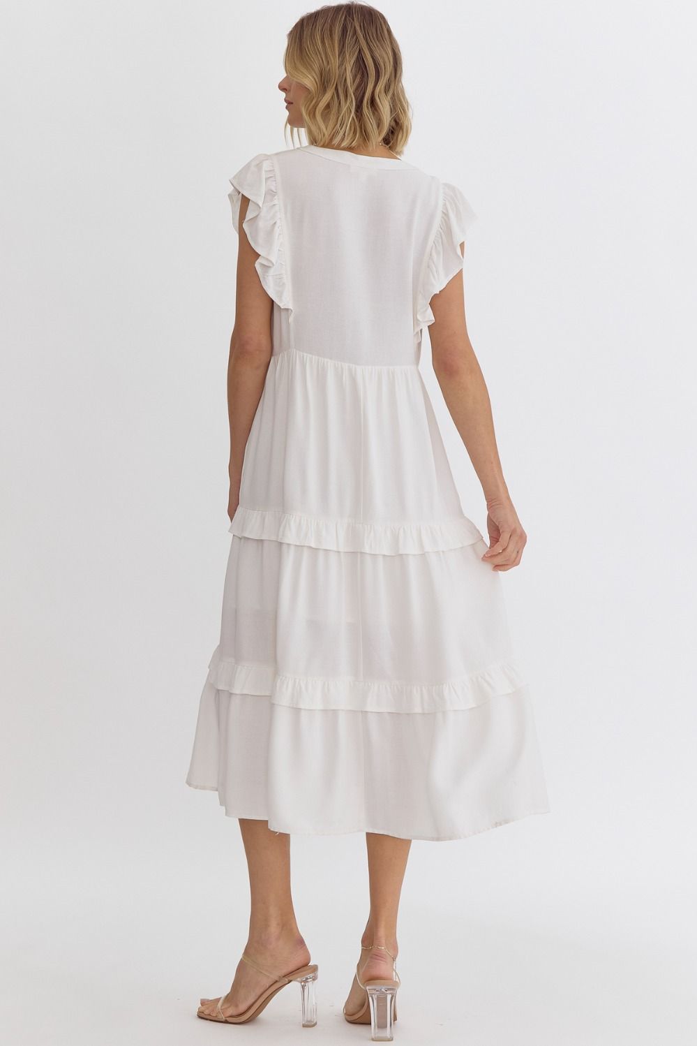 V-neck ruffle sleeve tiered midi dress. Pockets at side. Lined. Woven. Non-sheer. Lightweight.
