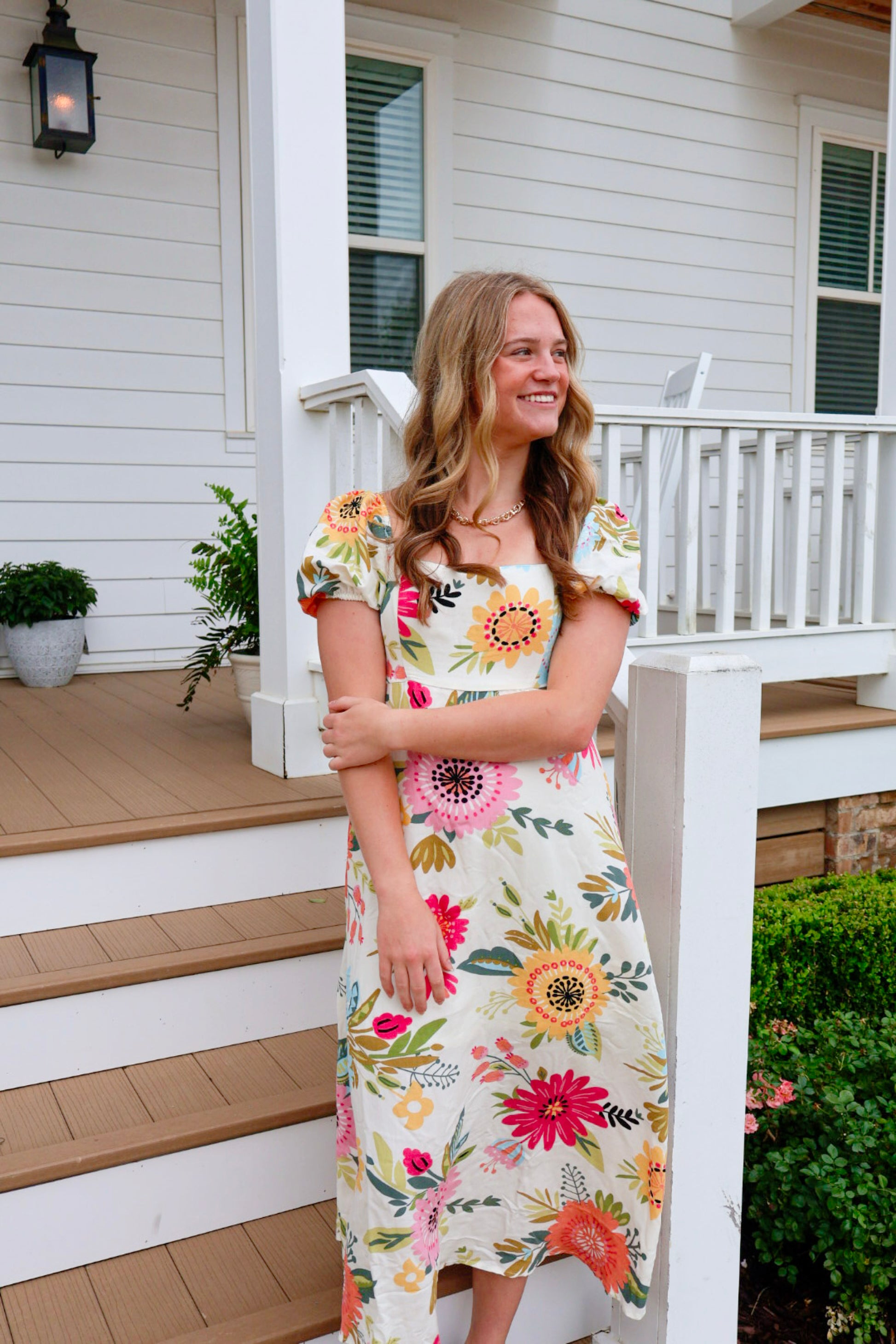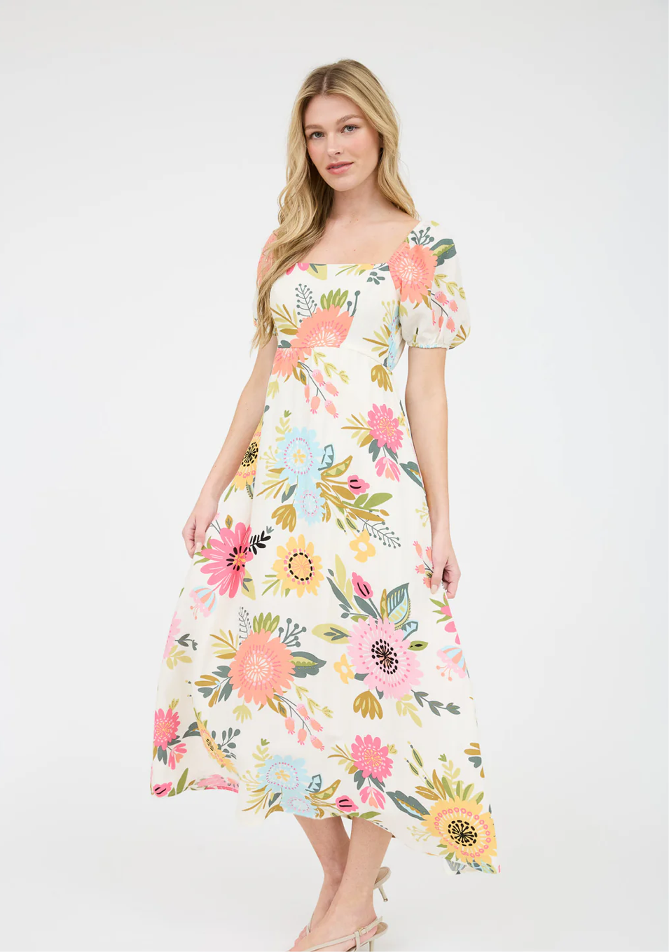 SQUARE NECKLINE SHORT PUFF SLEEVE ELASTIC CUFF BACK SMOCKING A-LINE FLORAL PRINT MIDI DRESS / MAXI DRESS