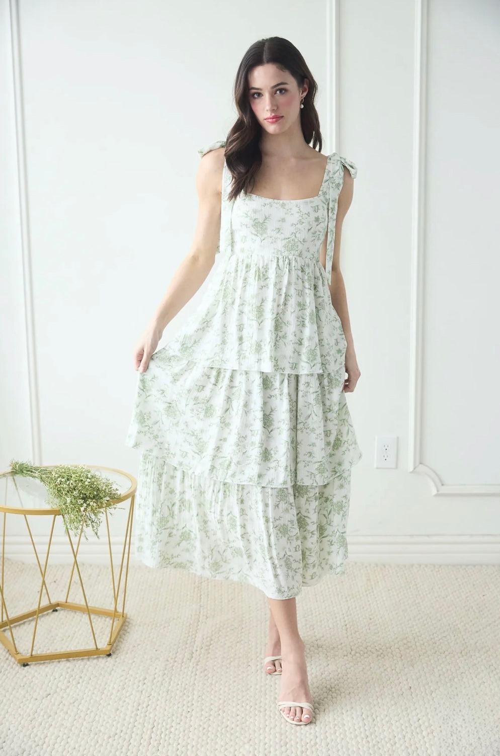 SQUARE NECKLINE SLEEVELESS TIE STRAP BACK SMOCKING RUFFLE TIERED LINED FLORAL PATTERN MIDI DRESS SHELL: 80% RAYON, 20% NYLON LINING: 100% POLYESTER