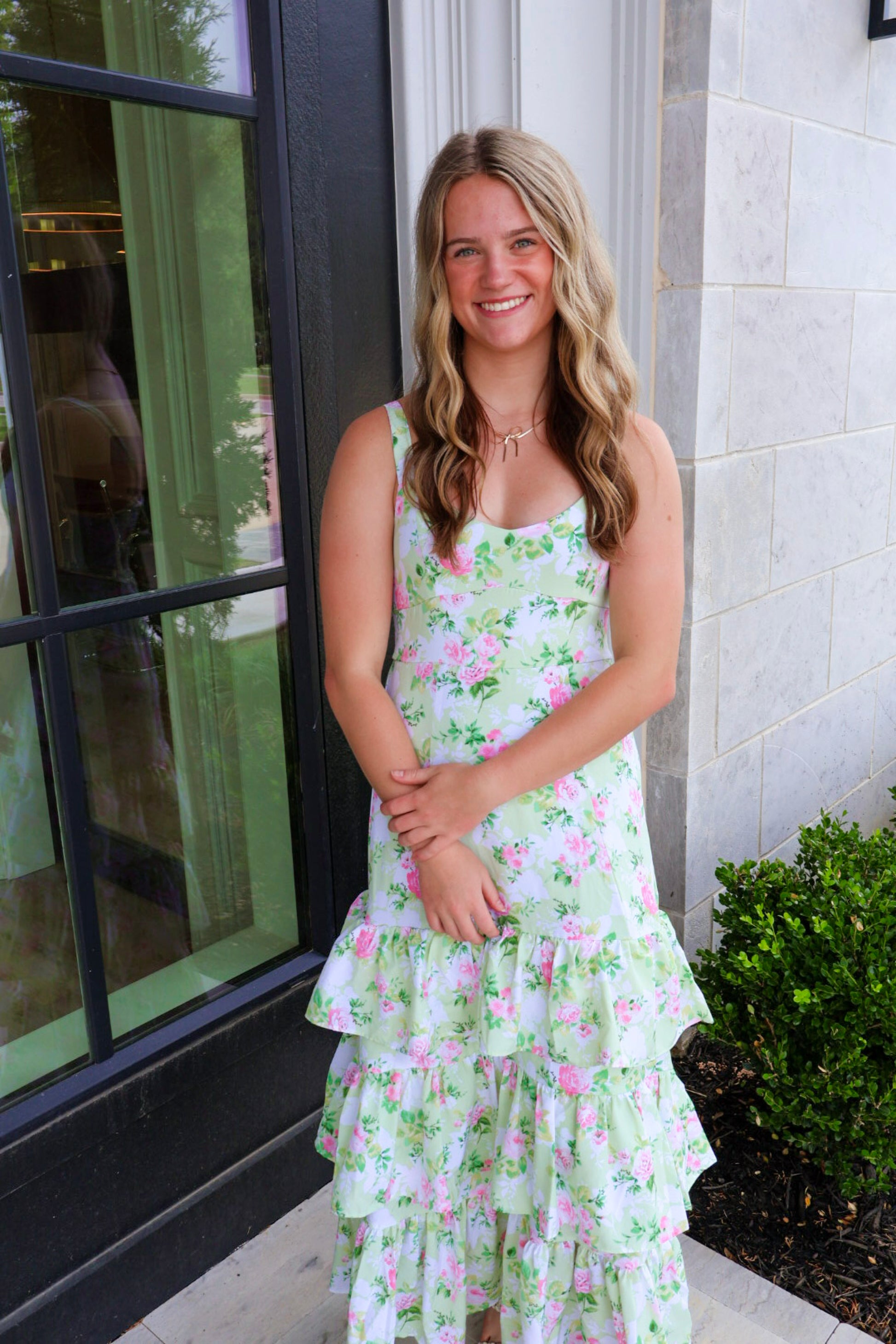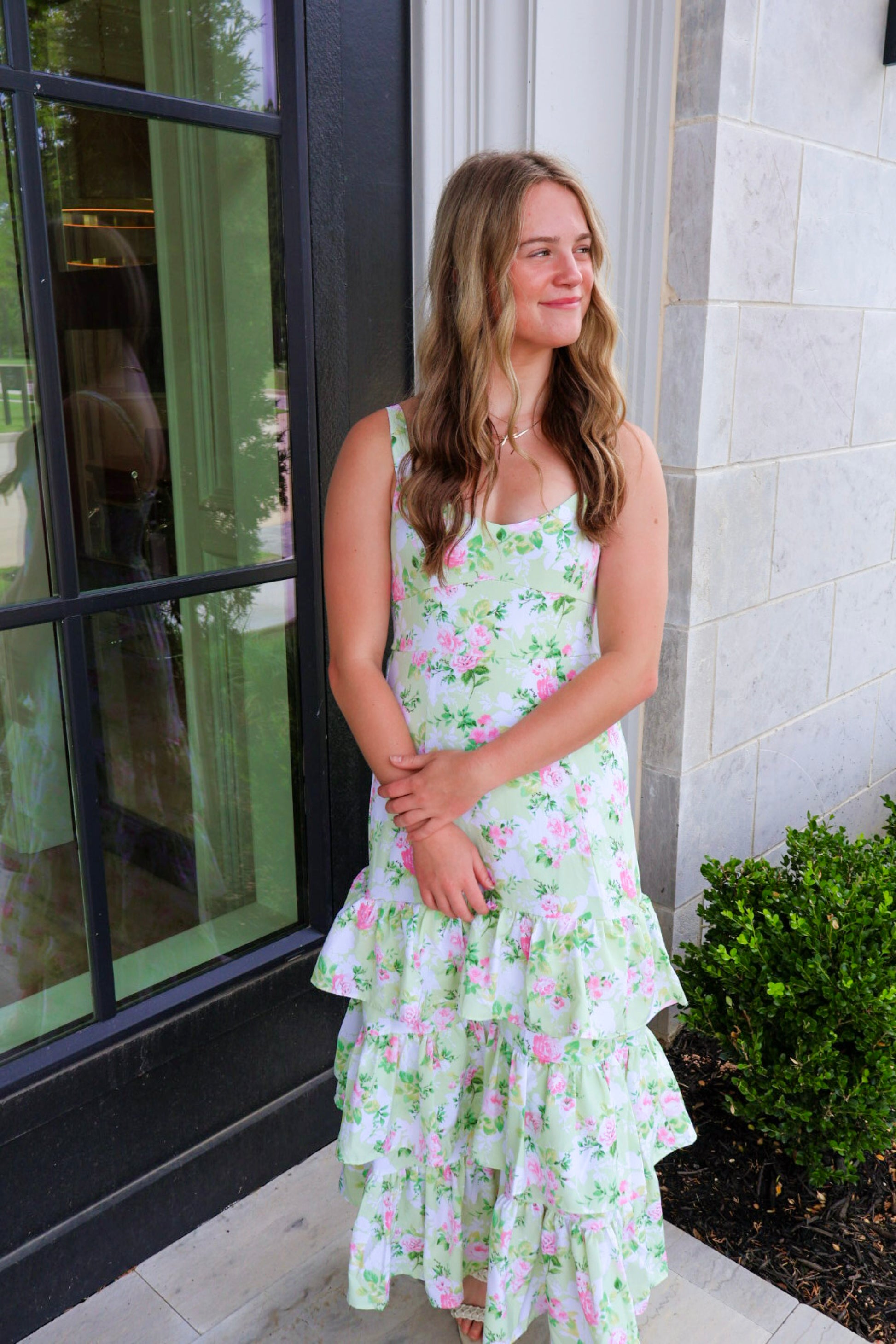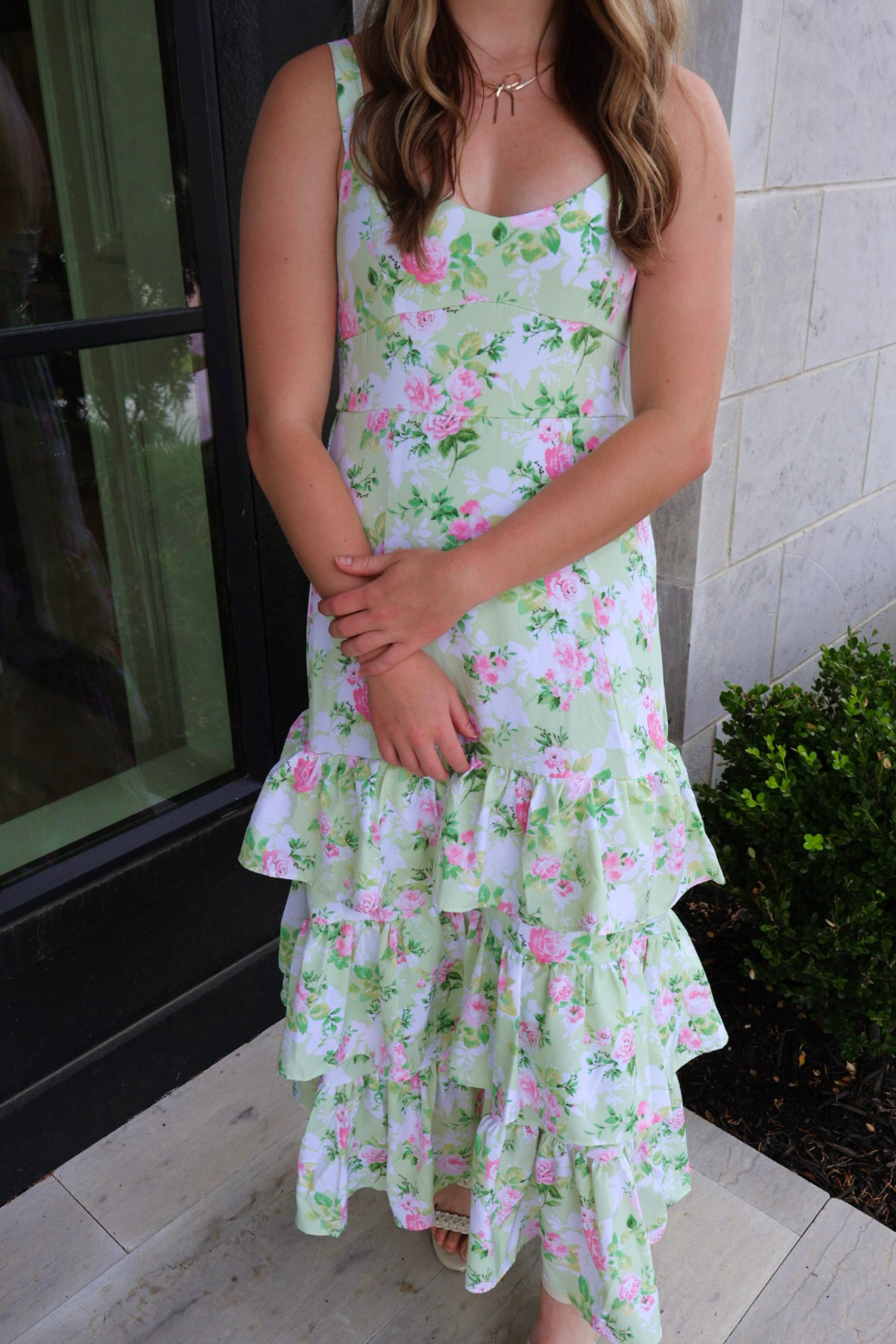 MINT GREEN SWEETHEART NECKLINE SLEEVELESS ADJUSTABLE STRAP BACK SMOCKING RUFFLE TIERED HEM FLORAL PATTERN LINED MIDI DRESS SHELL: 100% POLYESTER LINING: 100% POLYESTER