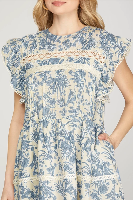 RUFFLE SLEEVE WOVEN FLORAL PRINT PINTUCK MINI DRESS WITH POCKETS AND LACE TRIM DETAIL