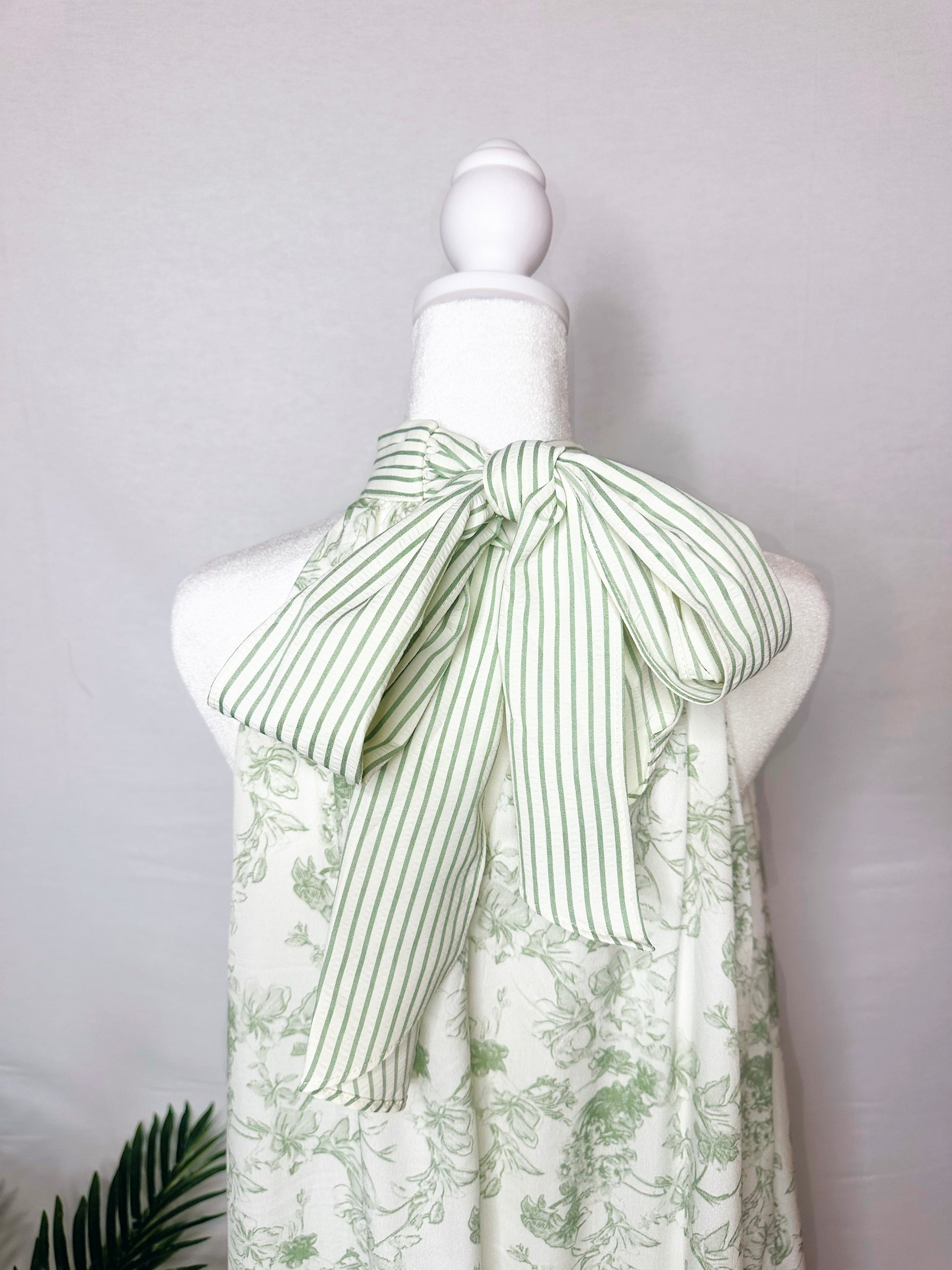 This maxi dress features a halter neck with a bow in the back, along with green and white coloring and intricate floral designs.