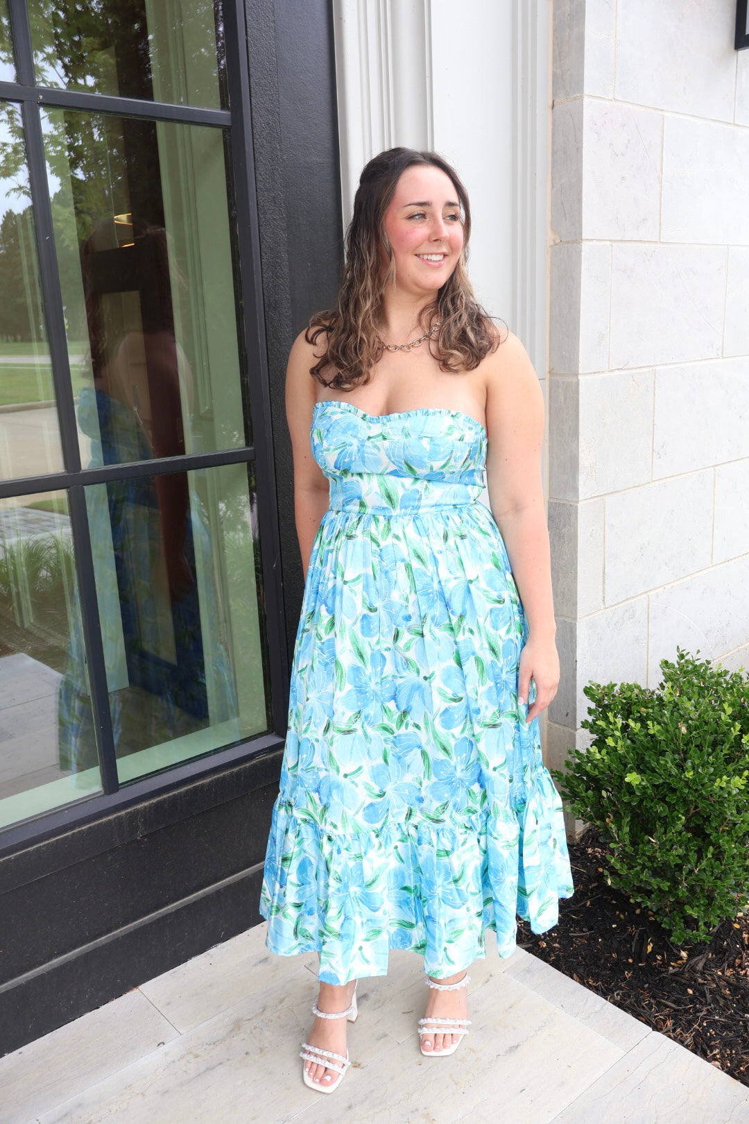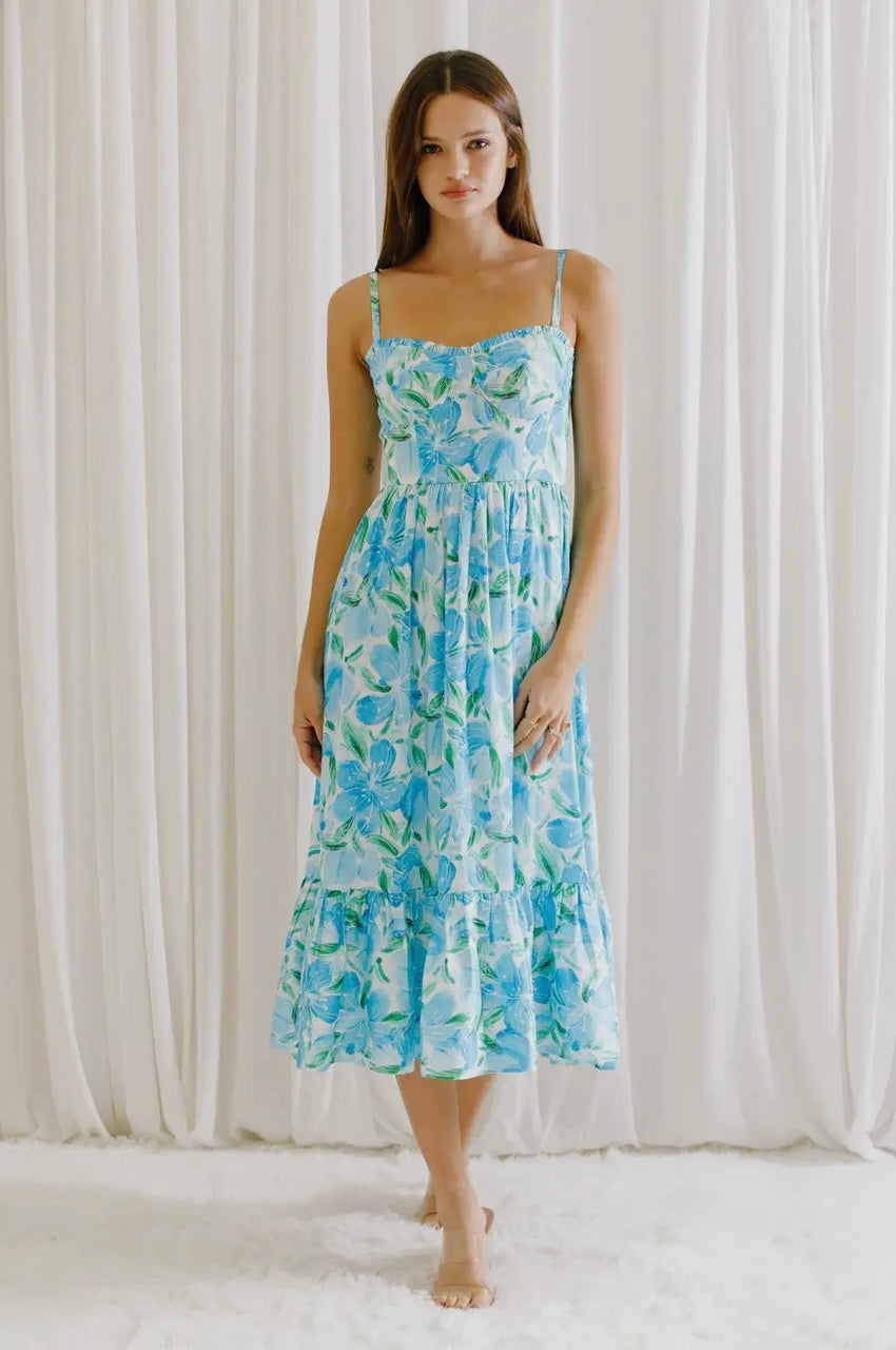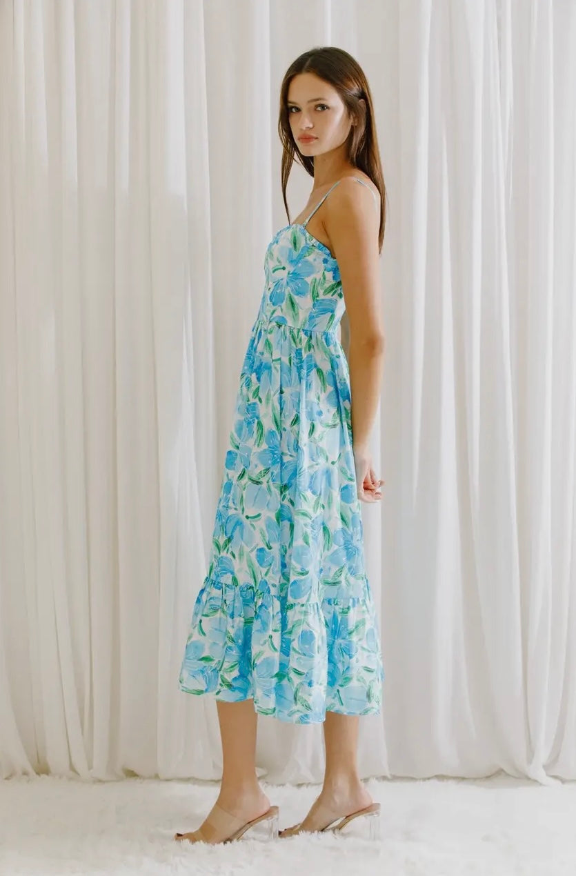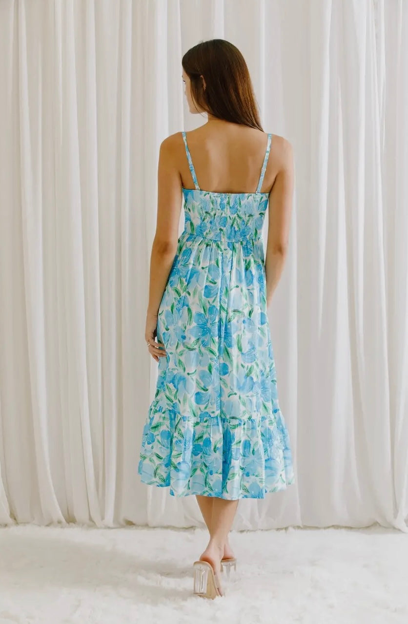 It also has a smocked upper back, back zipper, and ruffled hem.