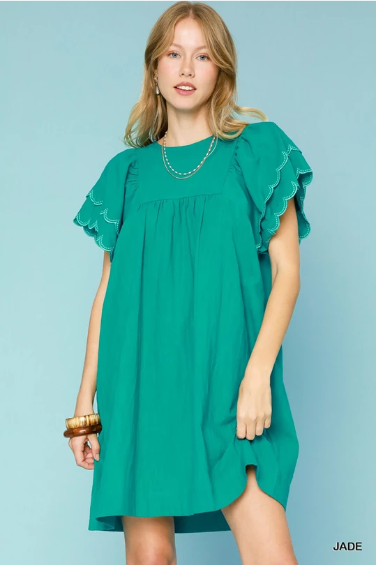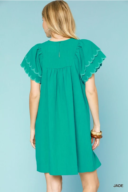No lining round neck mini dress with scalloped and embroidered sleeves