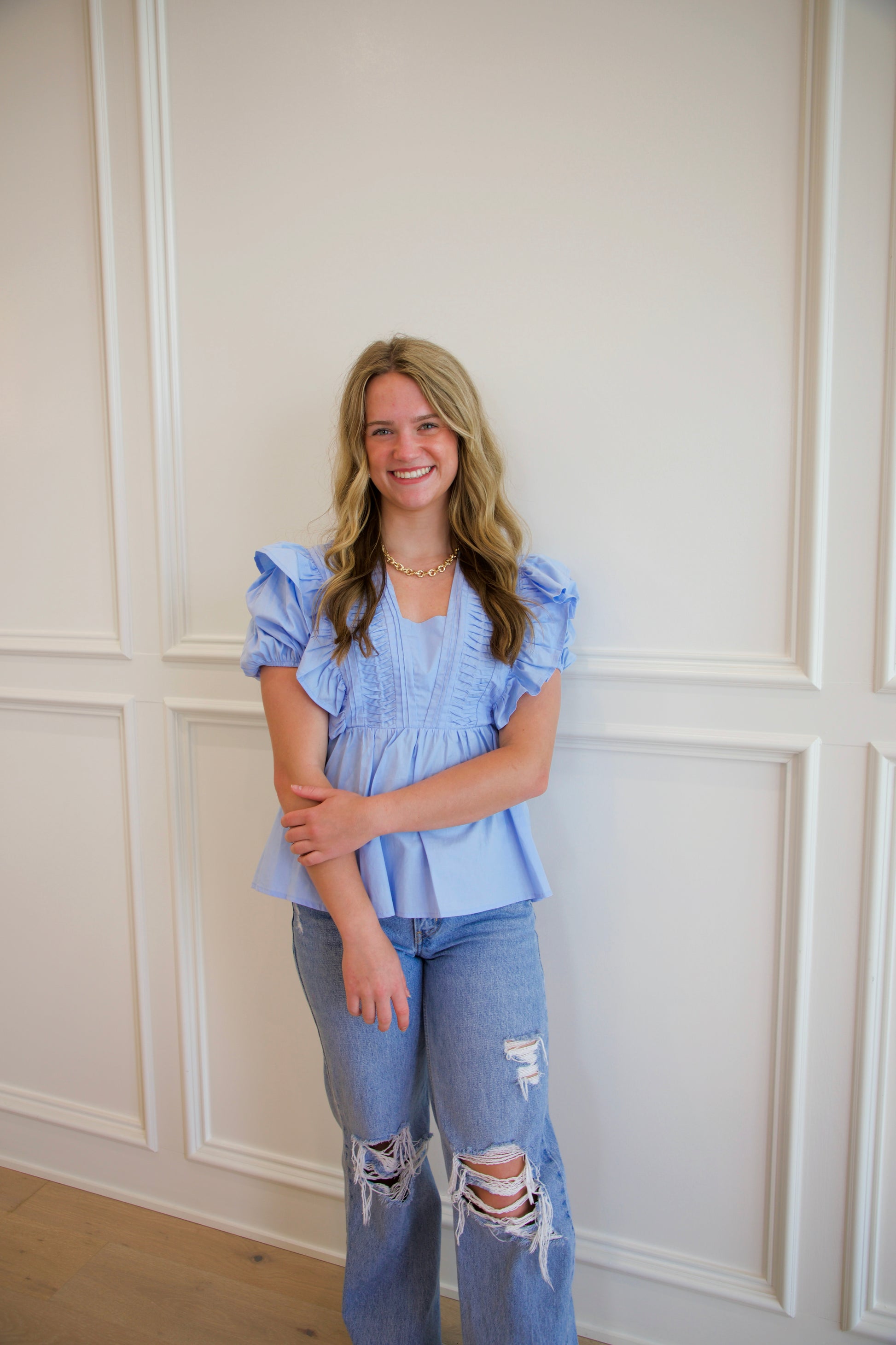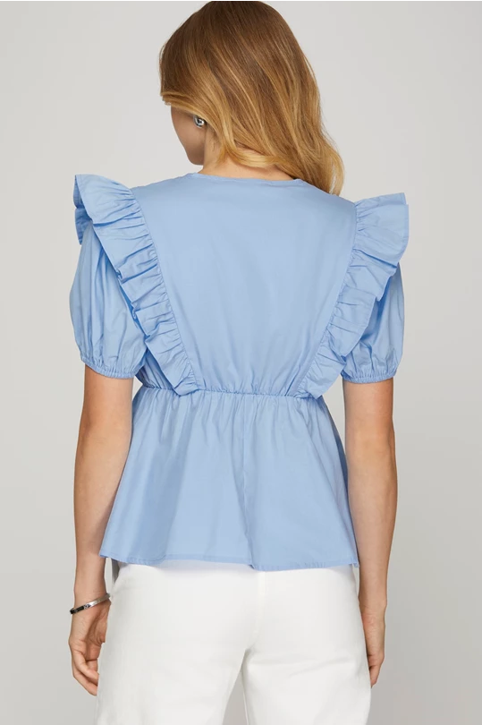 Light Blue Short Sleeve Pintuck Detail Top