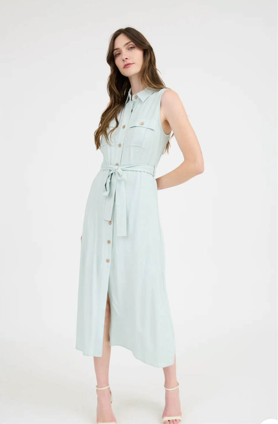 COLLARED BUTTON DOWN FUNCTIONAL BUTTONS SLEEVELESS POCKETS WITH TABS BELTED BELT LOOPS MIDI DRESS SOLID LINED SHELL: 80% RAYON, 20% LINEN LINING: 100% POLYESTER