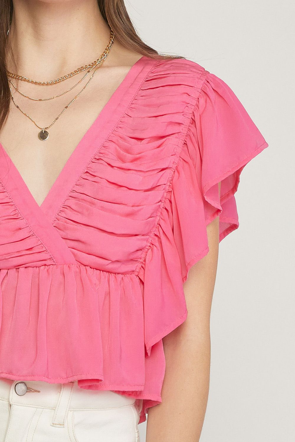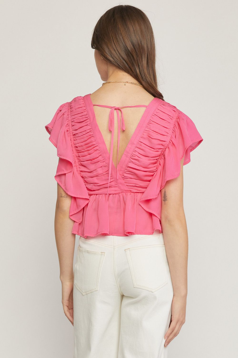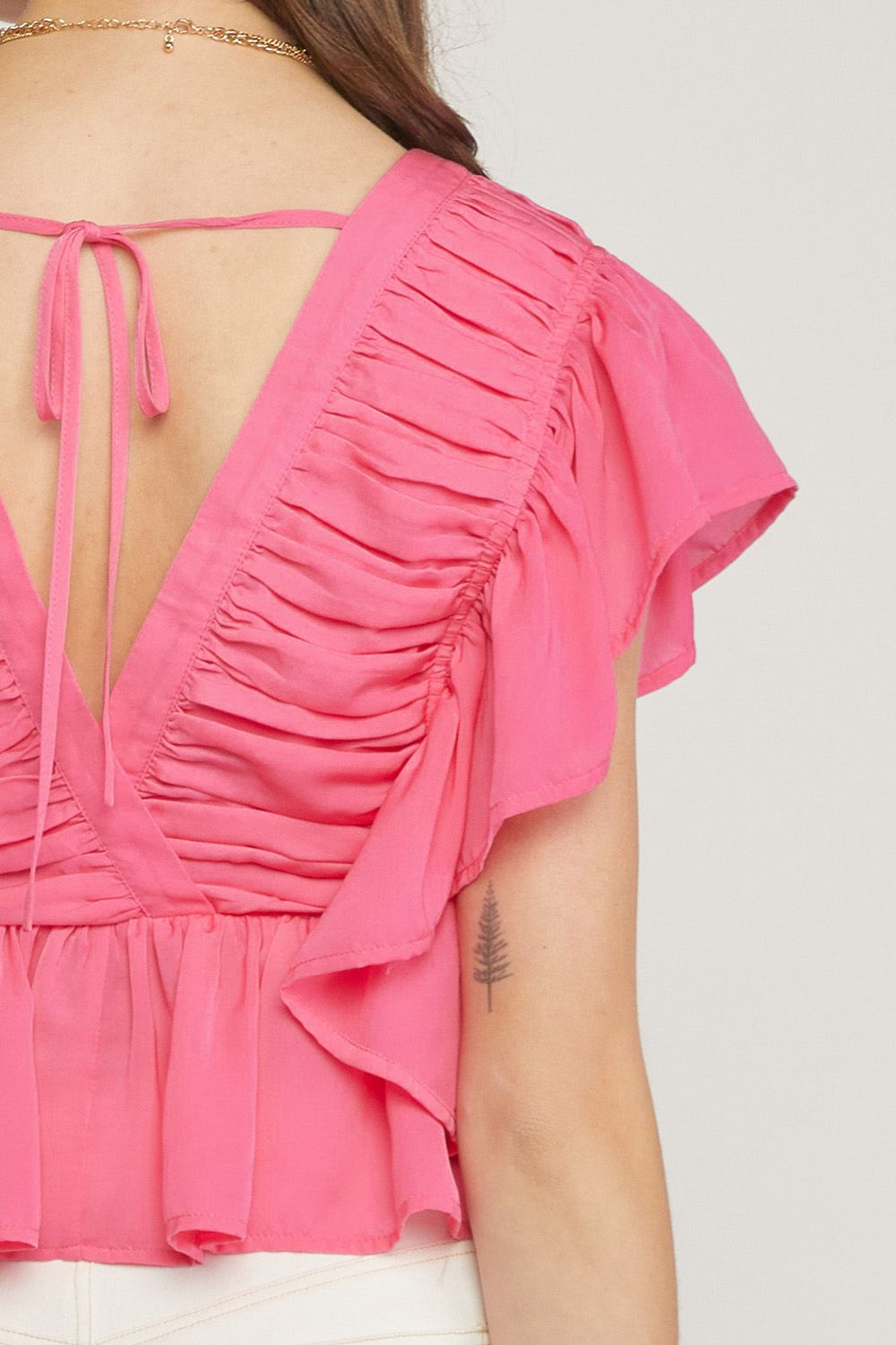 Solid v-neck butterfly sleeve top featuring pleated detailing and self tie at back. Lined. Woven. Non-sheer. Lightweight.