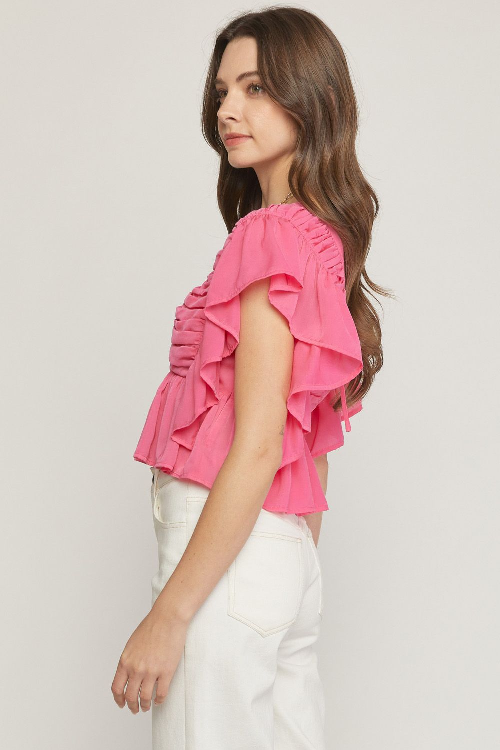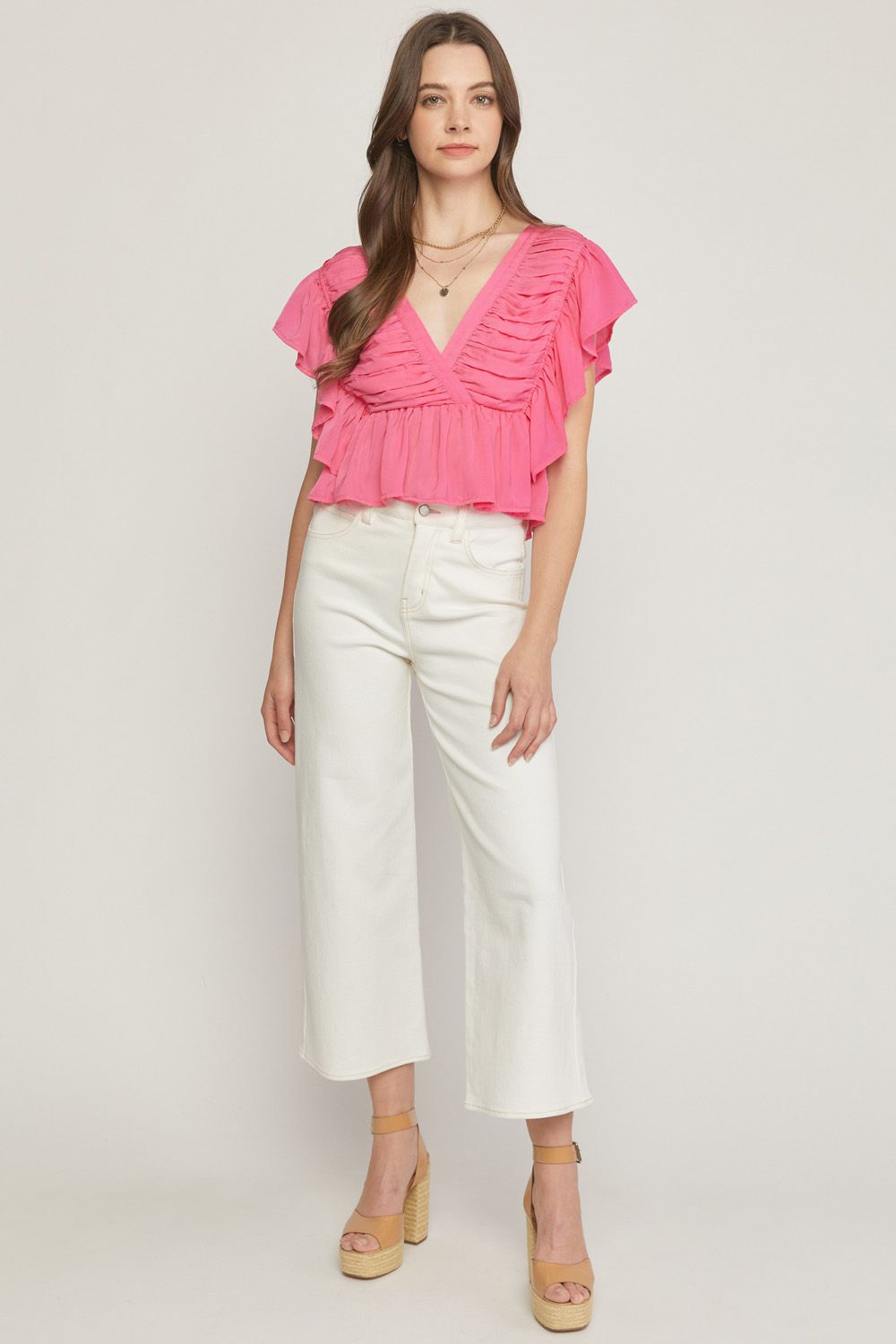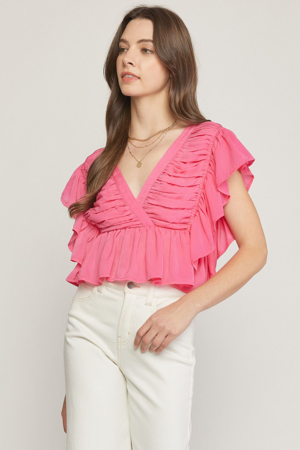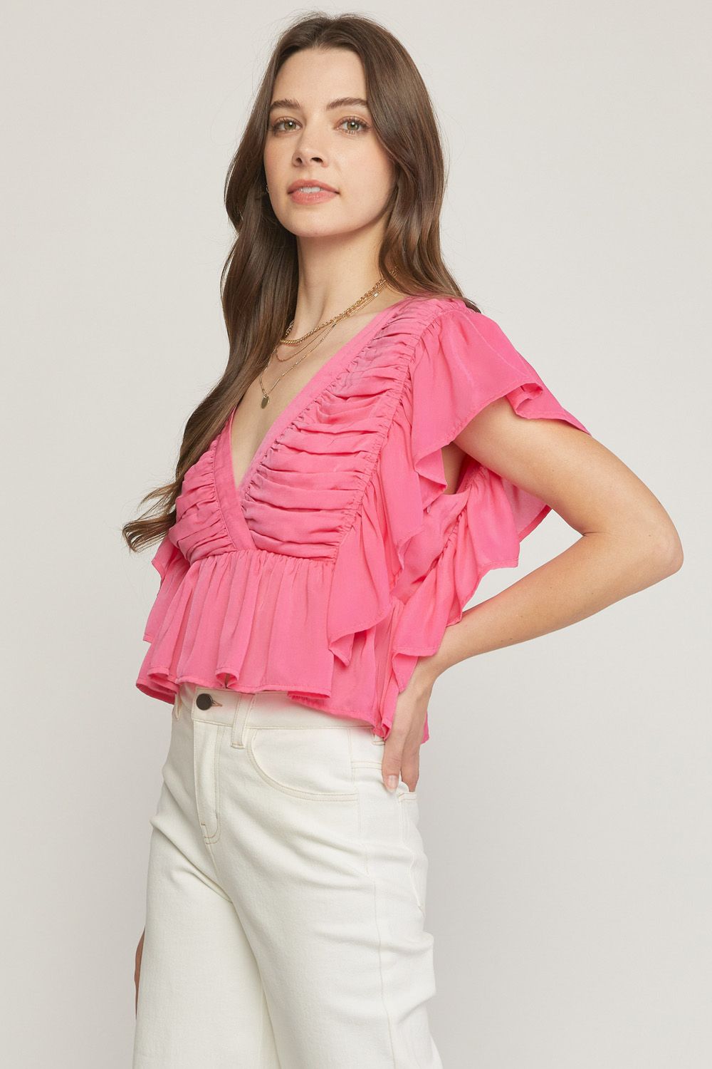 Solid v-neck butterfly sleeve top featuring pleated detailing and self tie at back. Lined. Woven. Non-sheer. Lightweight.