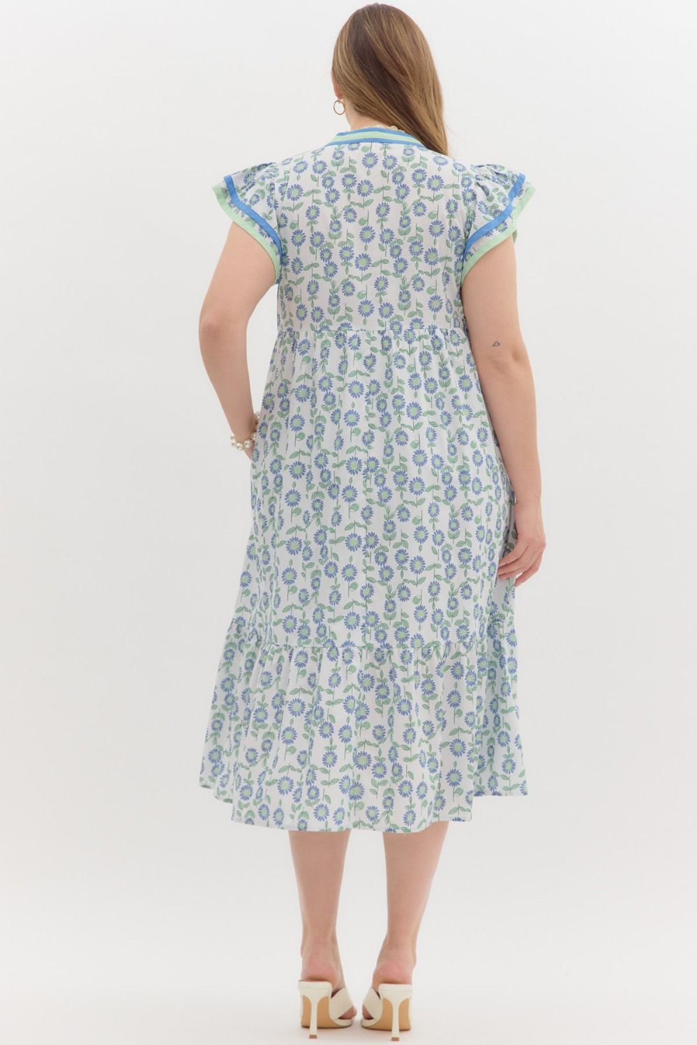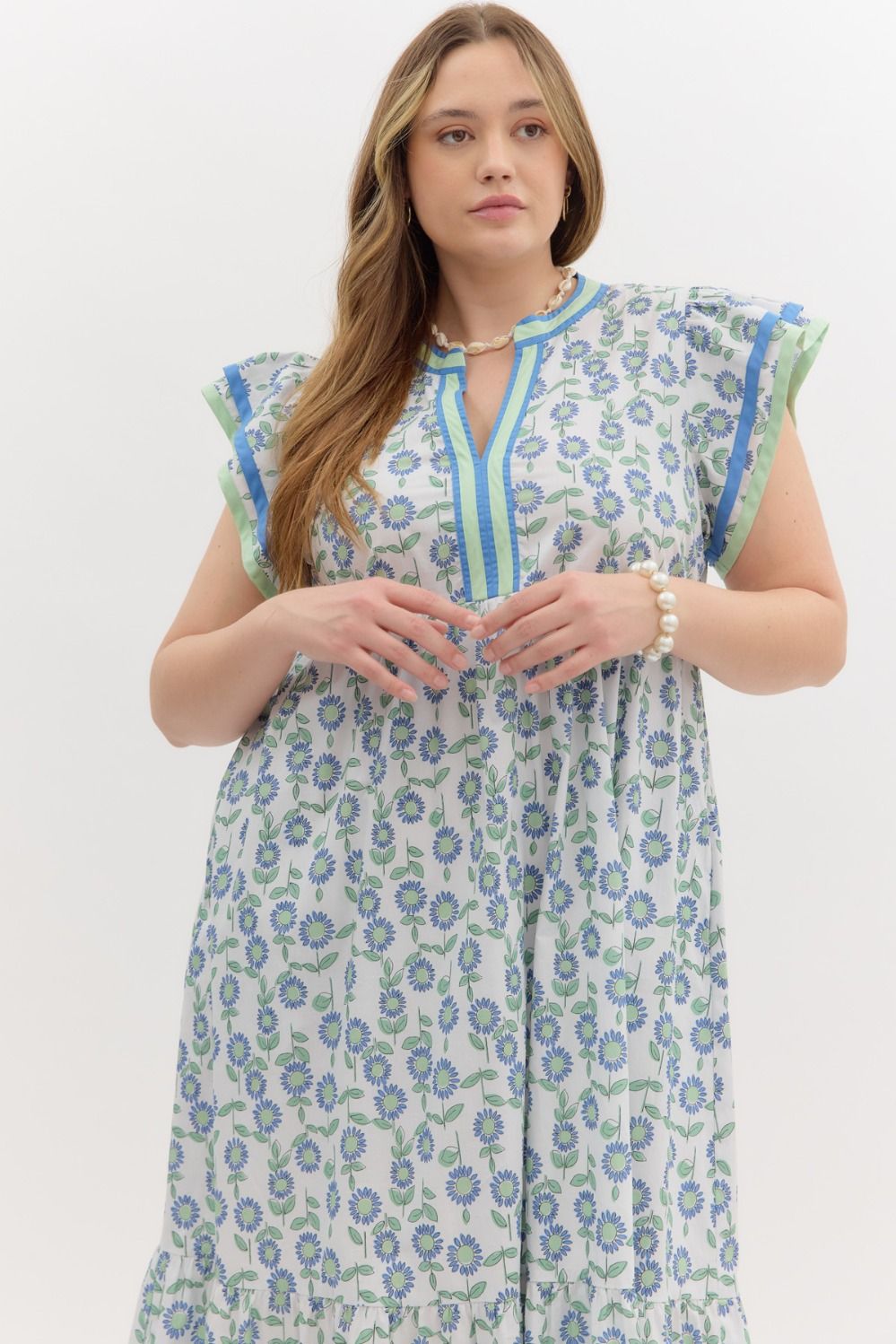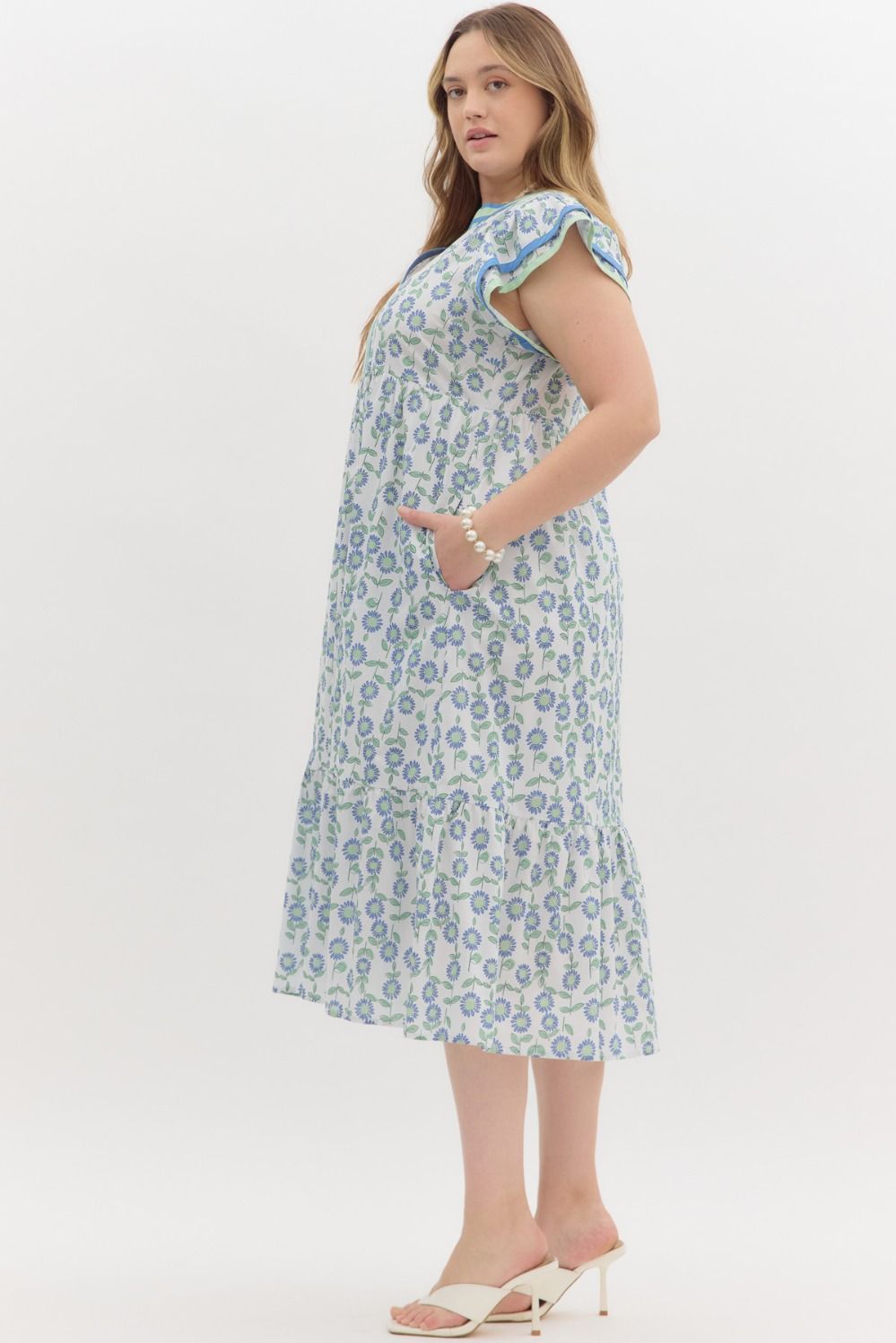 Floral print multicolor accented V-neck band pullover midi dress. Flutter sleeve featuring contrast accented binding finish. Pockets at sides. Lined. Woven. Non-sheer. Lightweight.