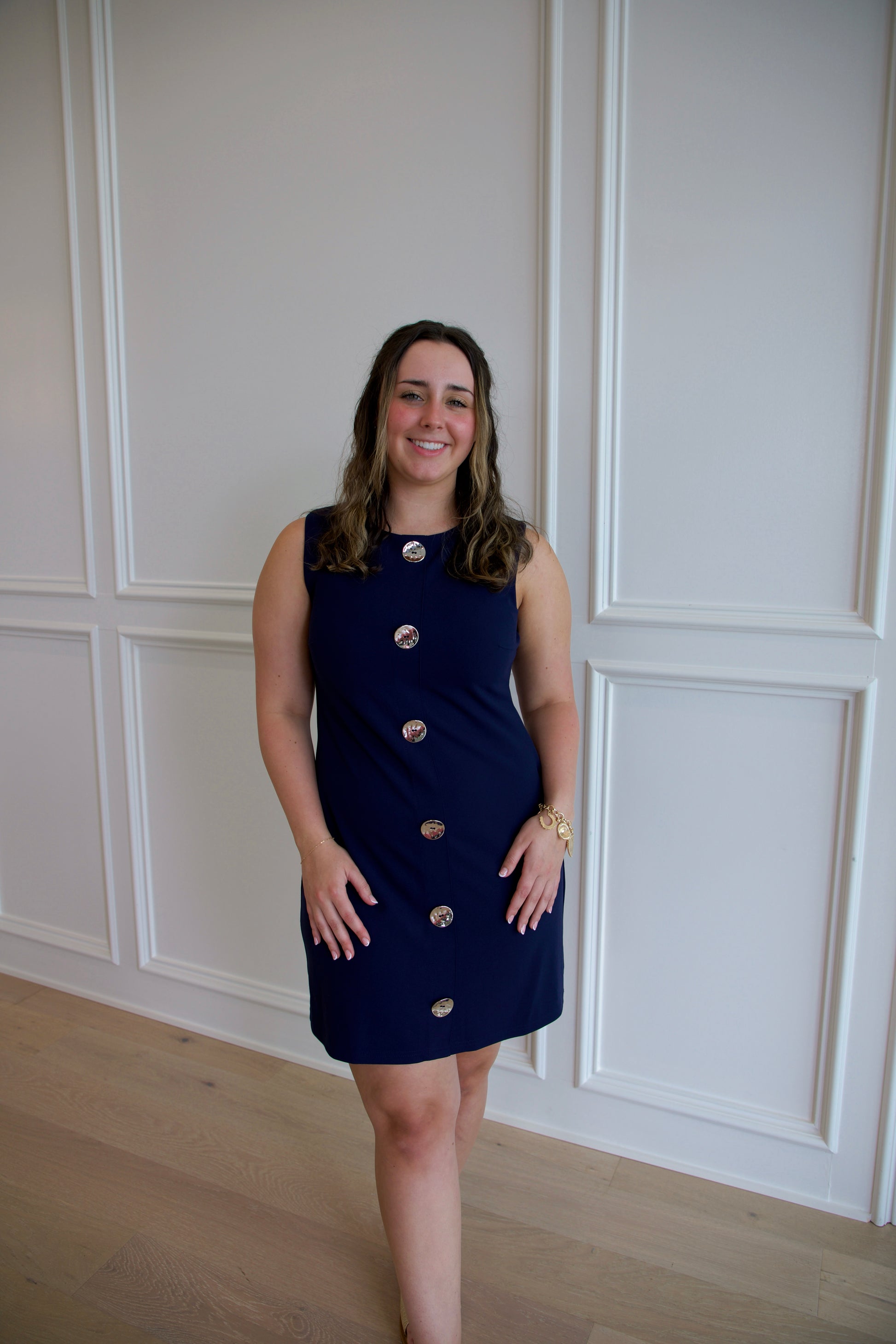 Navy button down dress sleeveless.