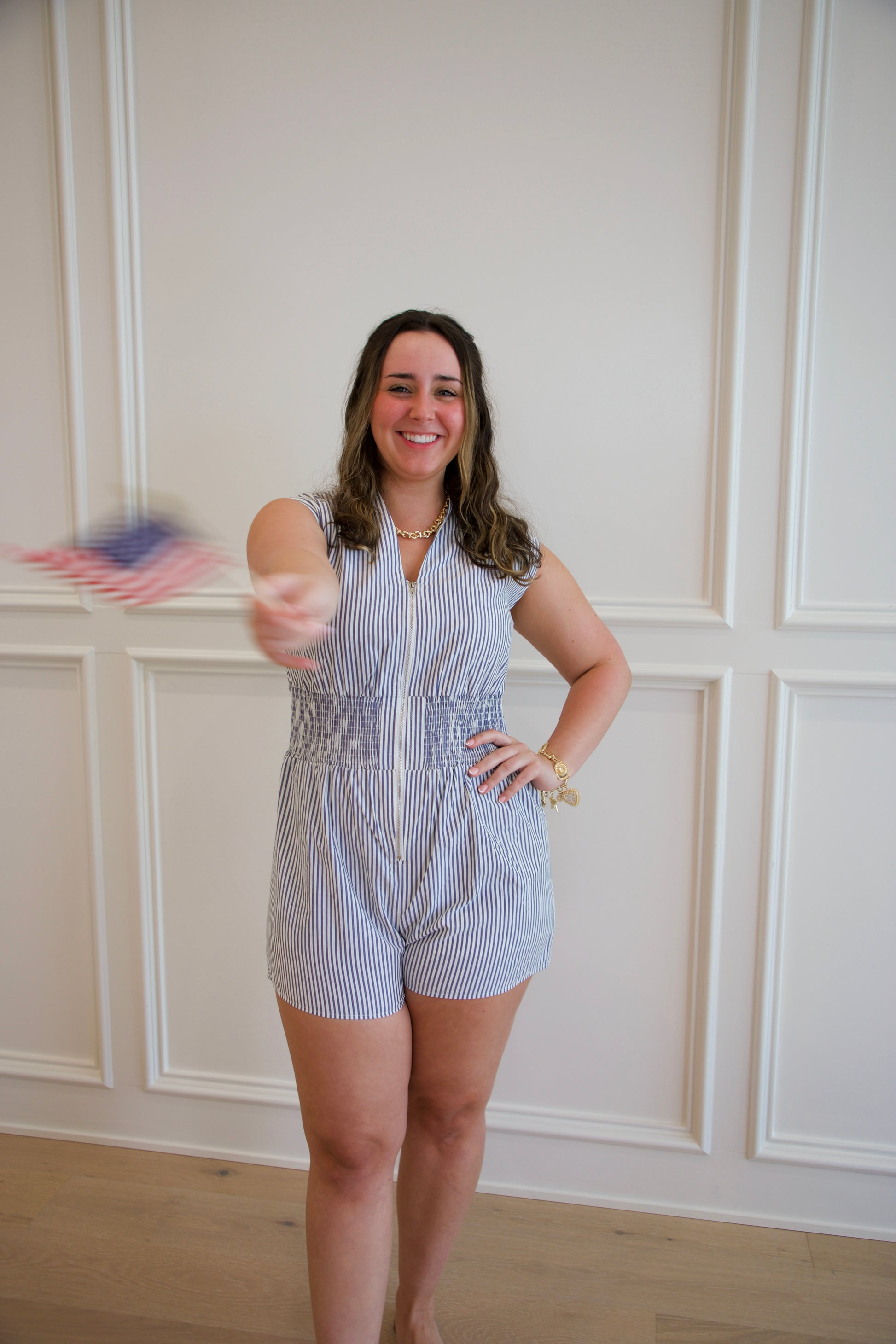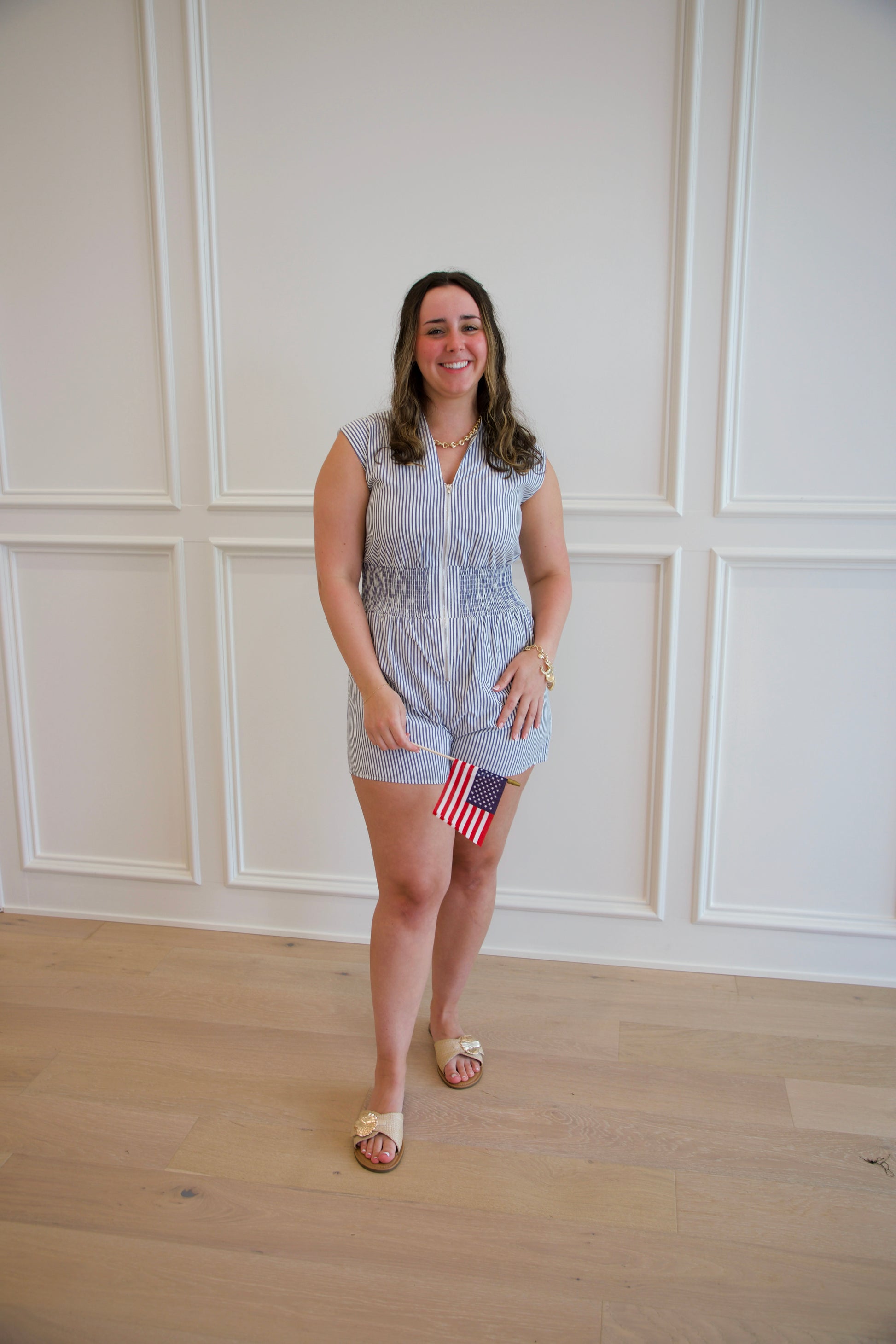 CAP SLEEVE NAVY STRIPED WOVEN STRIPE SMOCKED WAIST FRONT ZIP ROMPER WITH POCKETS