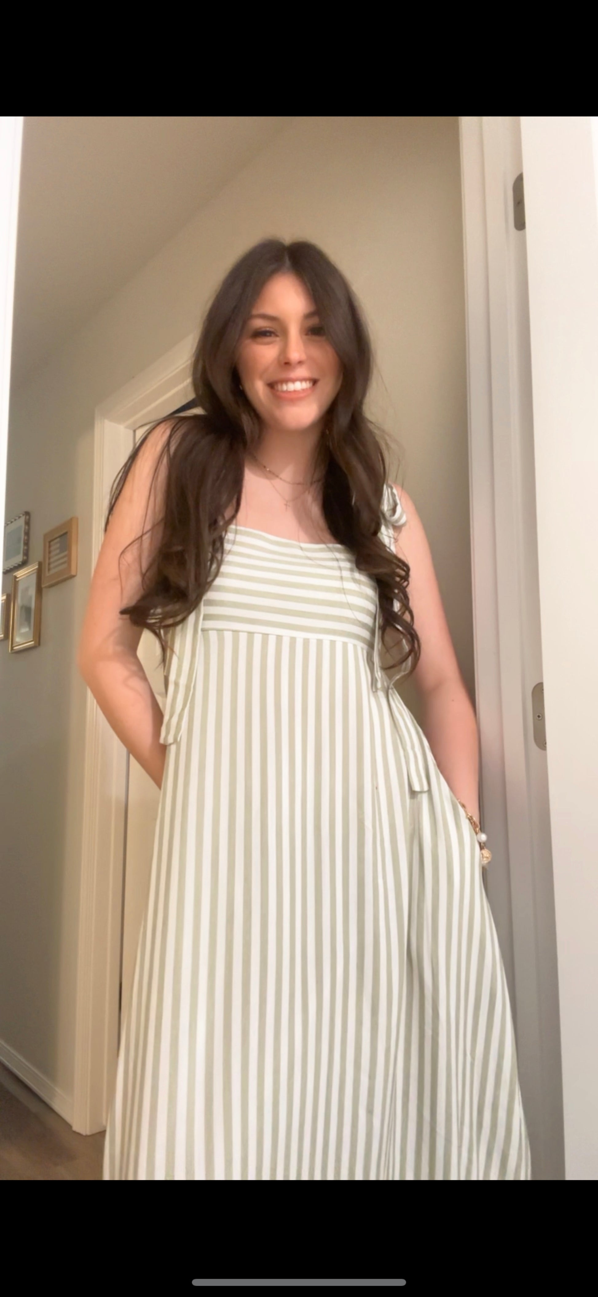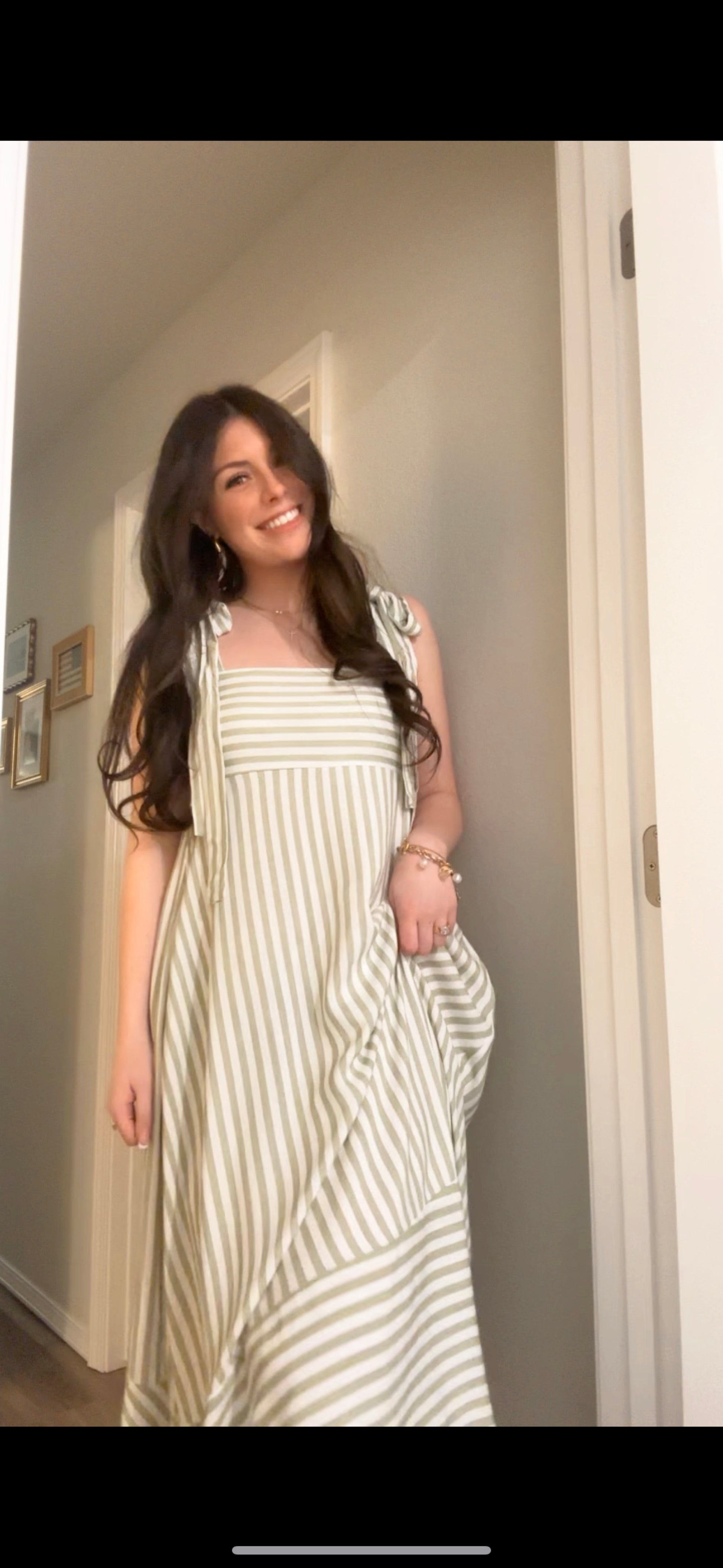 Elevate your style with the Lauren Dress in light olive. This maxi dress features a trendy white stripe pattern and delicate tie straps. Perfect for your next brunch date or summer getaway, this dress will have you looking effortlessly girly and chic.
