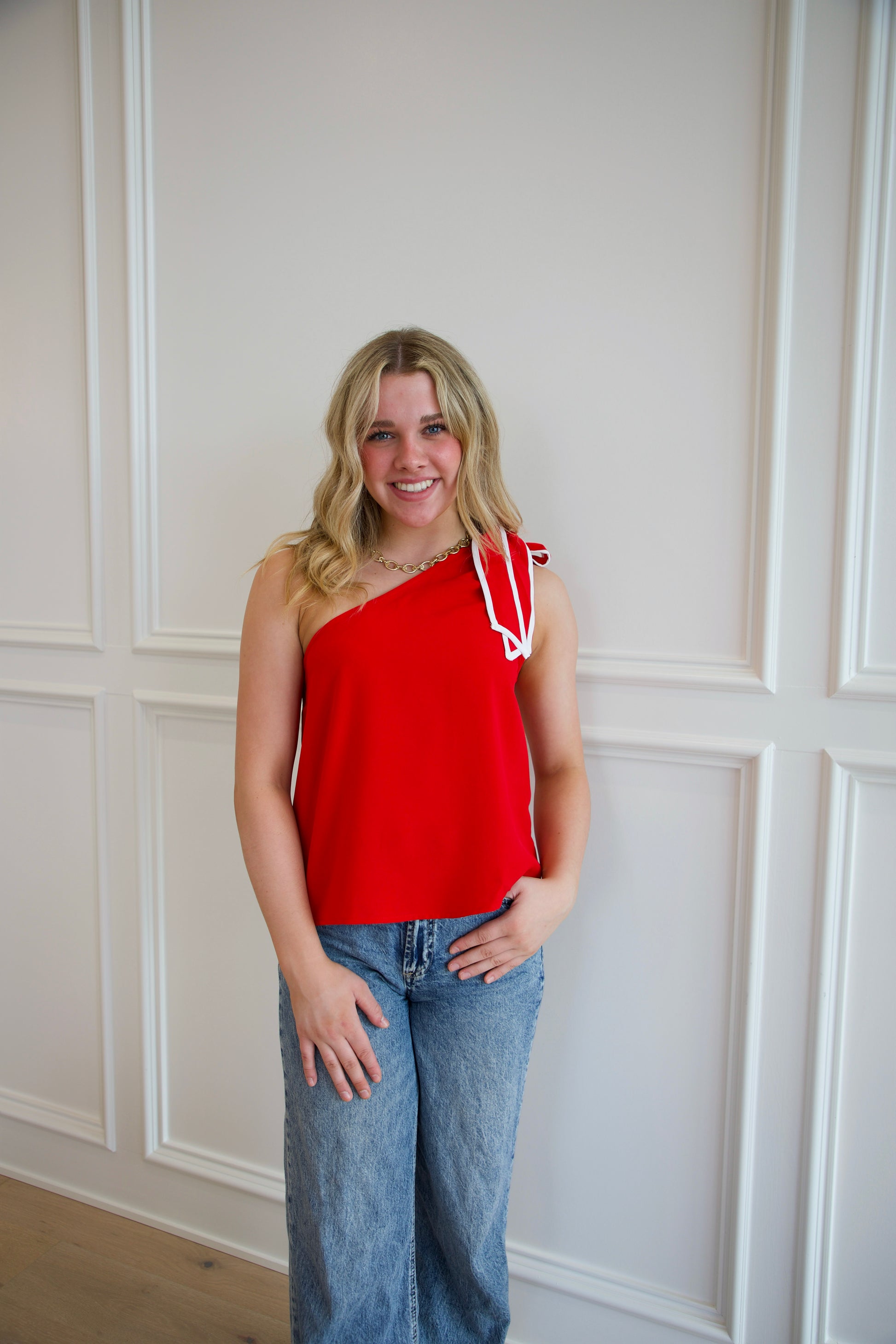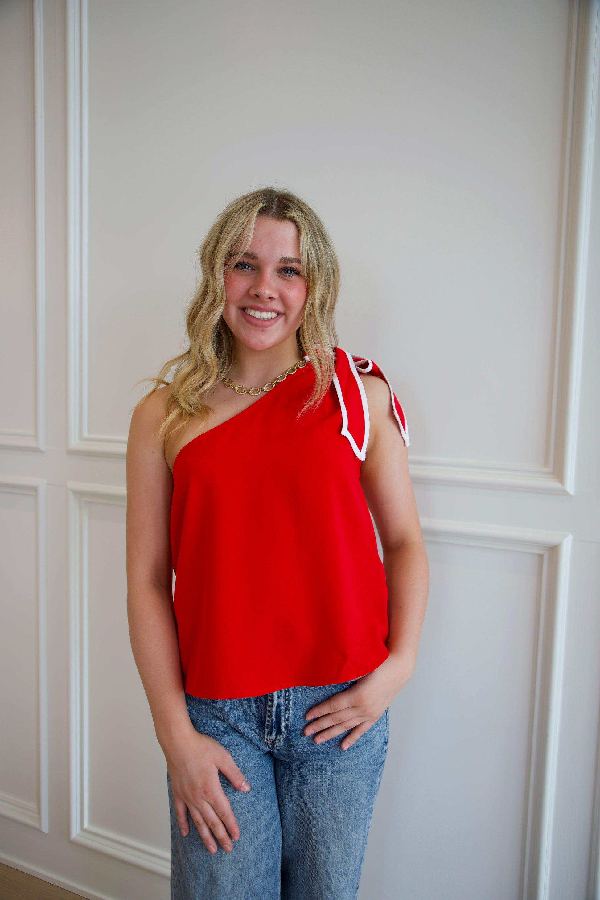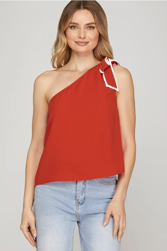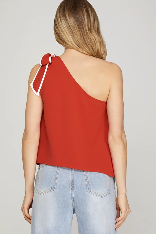 ONE SHOULDER WOVEN TOP WITH CONTRAST EDGE BINDING SHOULDER BOW TIE