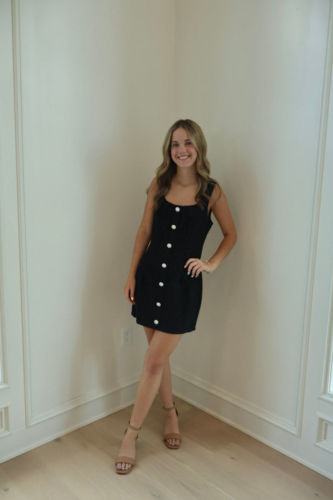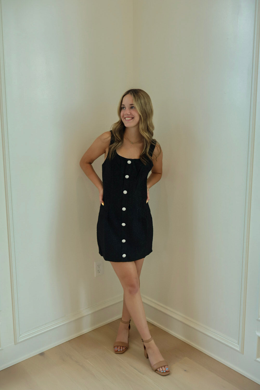 Perfect date night, tweed, black mini dress with a central pearl button.