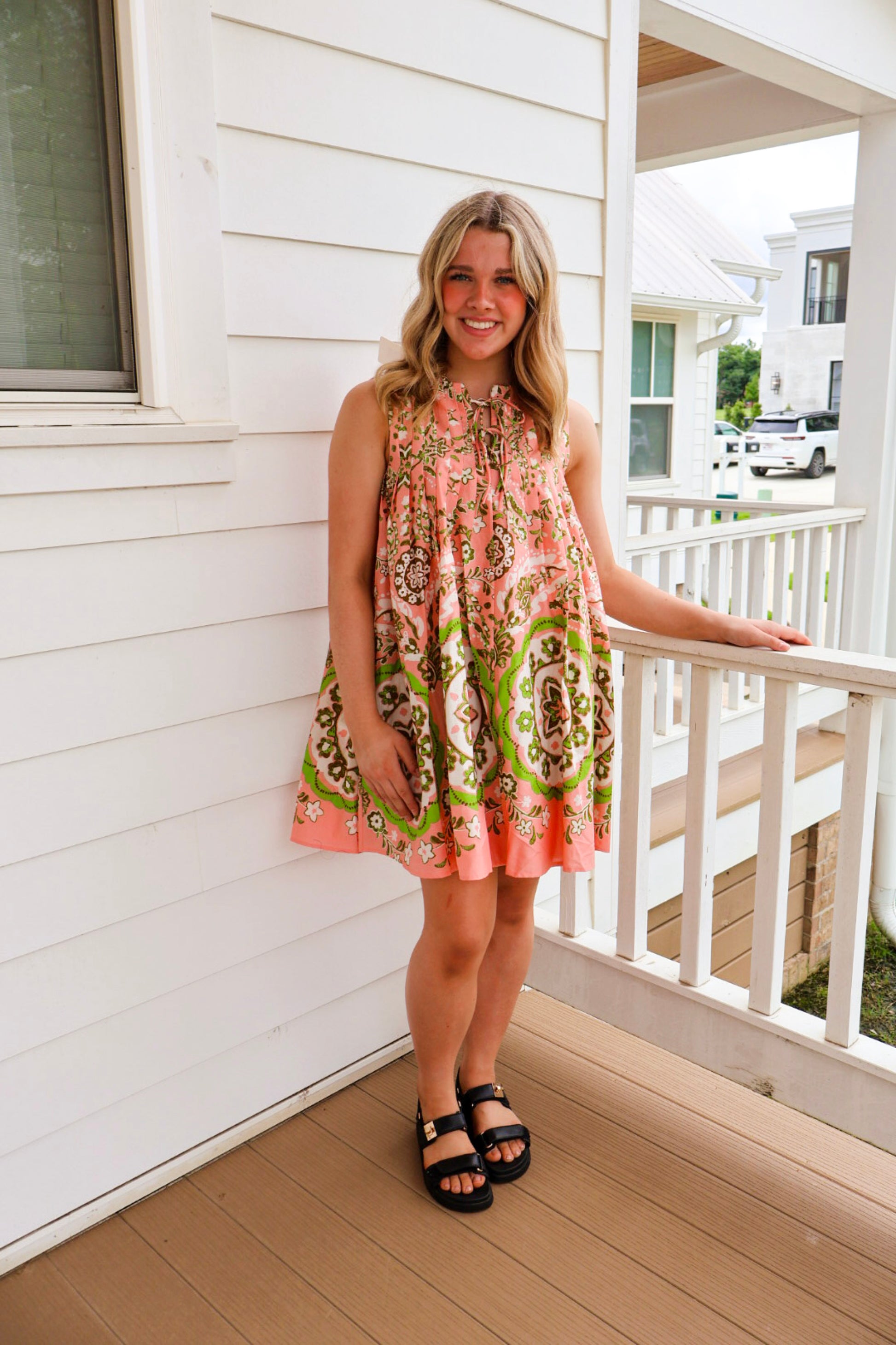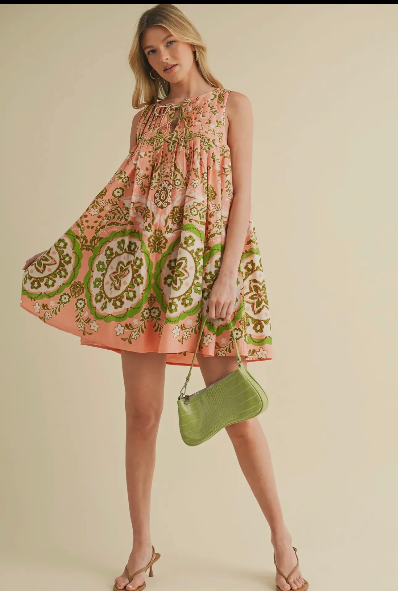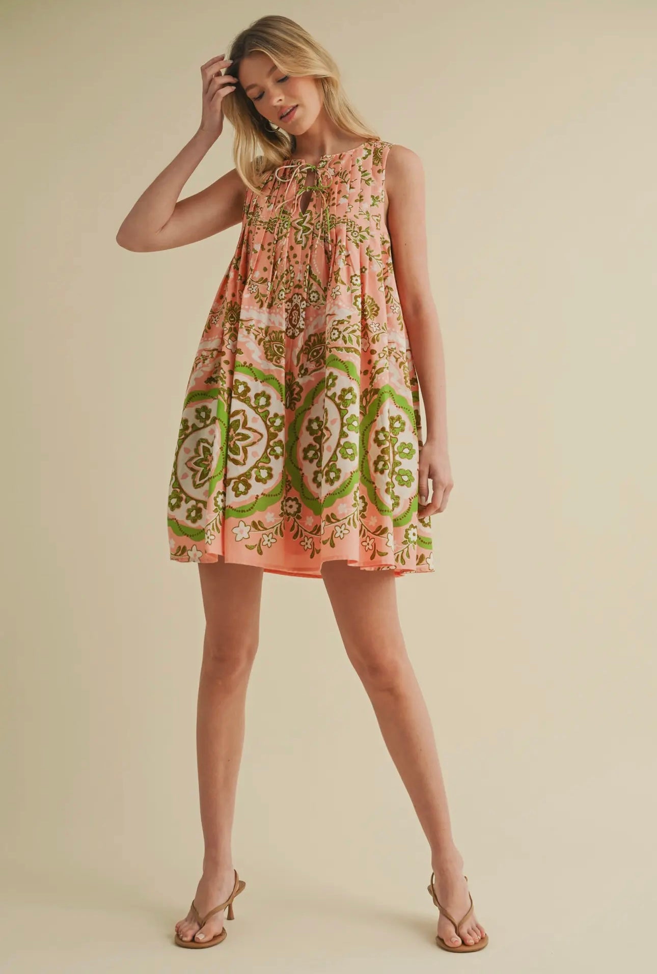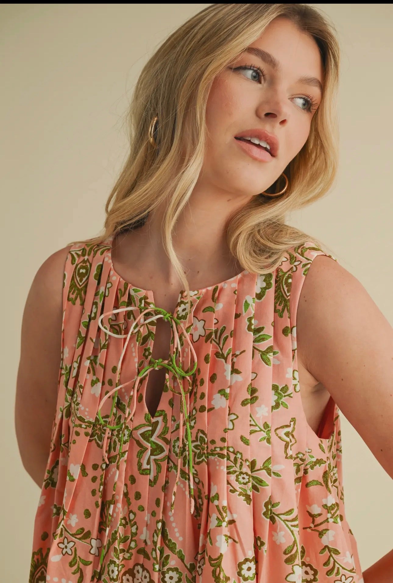From brunch dates to concerts in the park, this pleated sleeveless mini dress is the perfect look for those warmer days! This mini has a notched V neckline with double tying closure detail. The relaxed shift bodice features elegant pleated detail on the front and back and falls to a mini hem with pockets. Pair this easy-to-wear dress with any of your favorite Spring shoes for the perfect warm weather look!