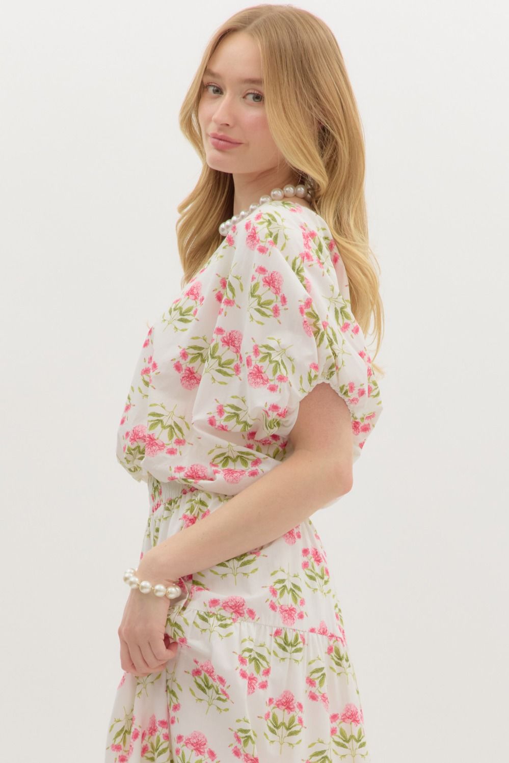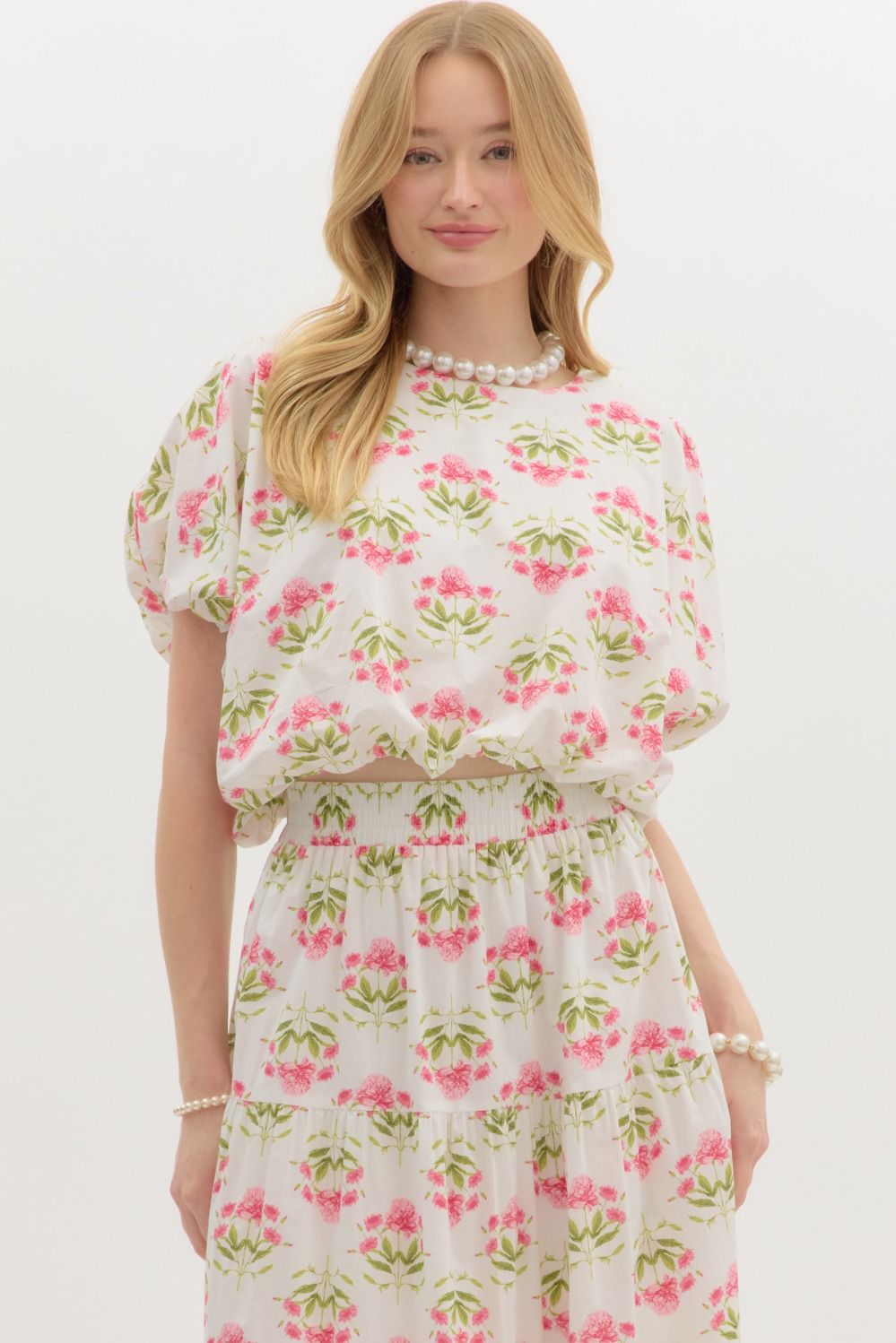 Floral print waist-length bubble hem pullover top. Single button keyhole back closure. Lined. Woven. Non-sheer. Lightweight.
