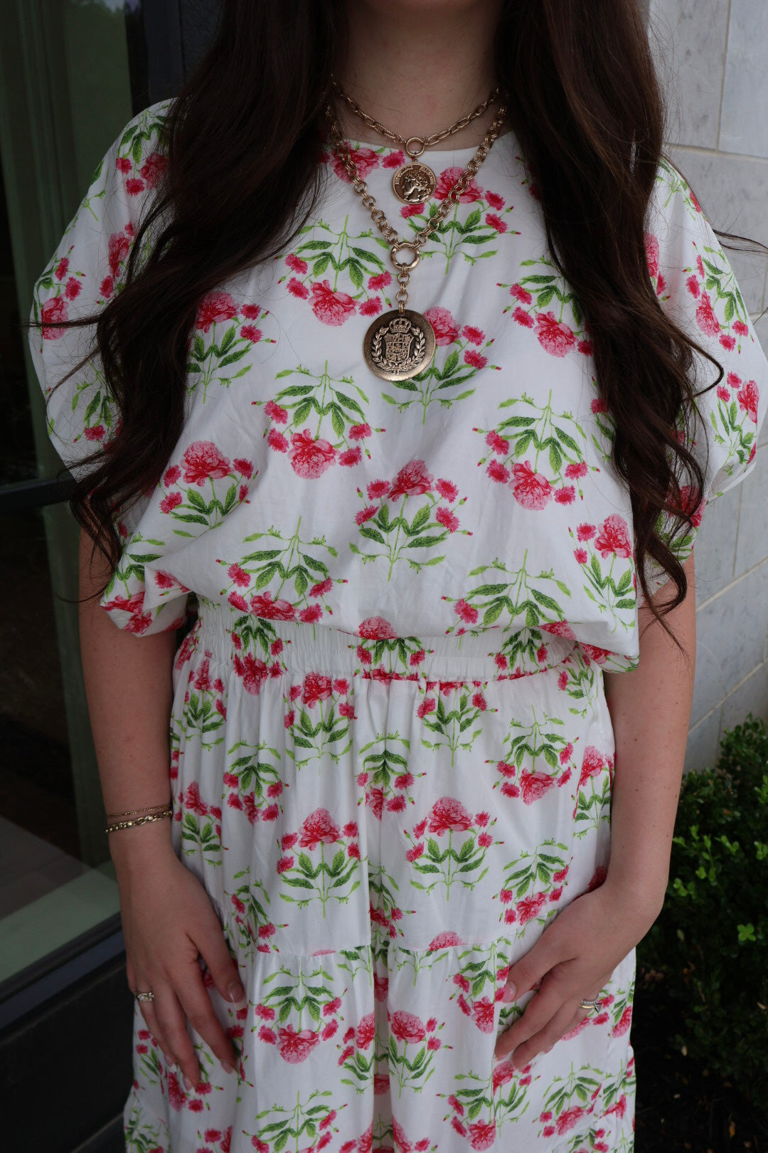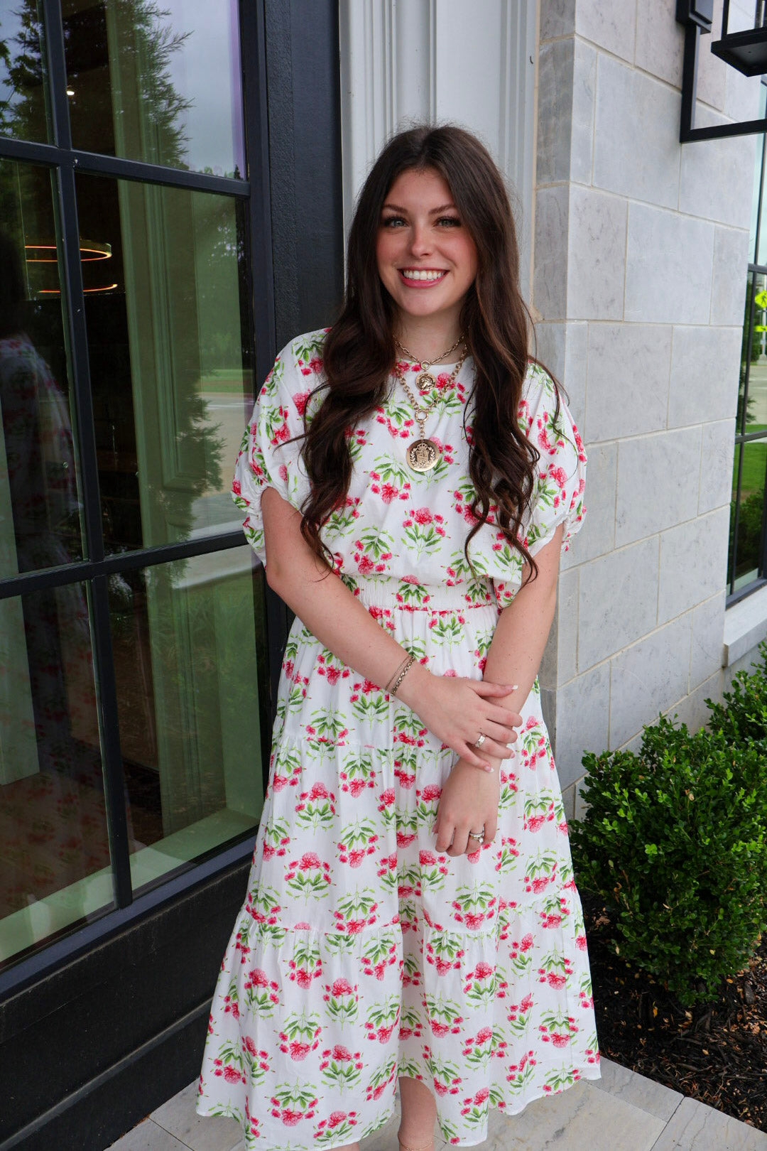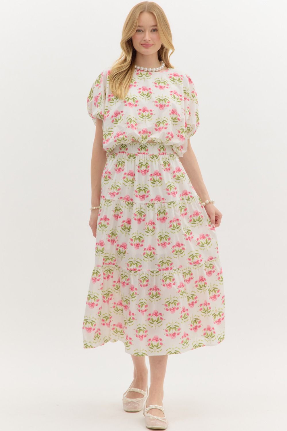 Floral print high waist tiered midi skirt. Elasticated waistband. Pockets at sides. Lined. Woven. Non-sheer. Lightweight.