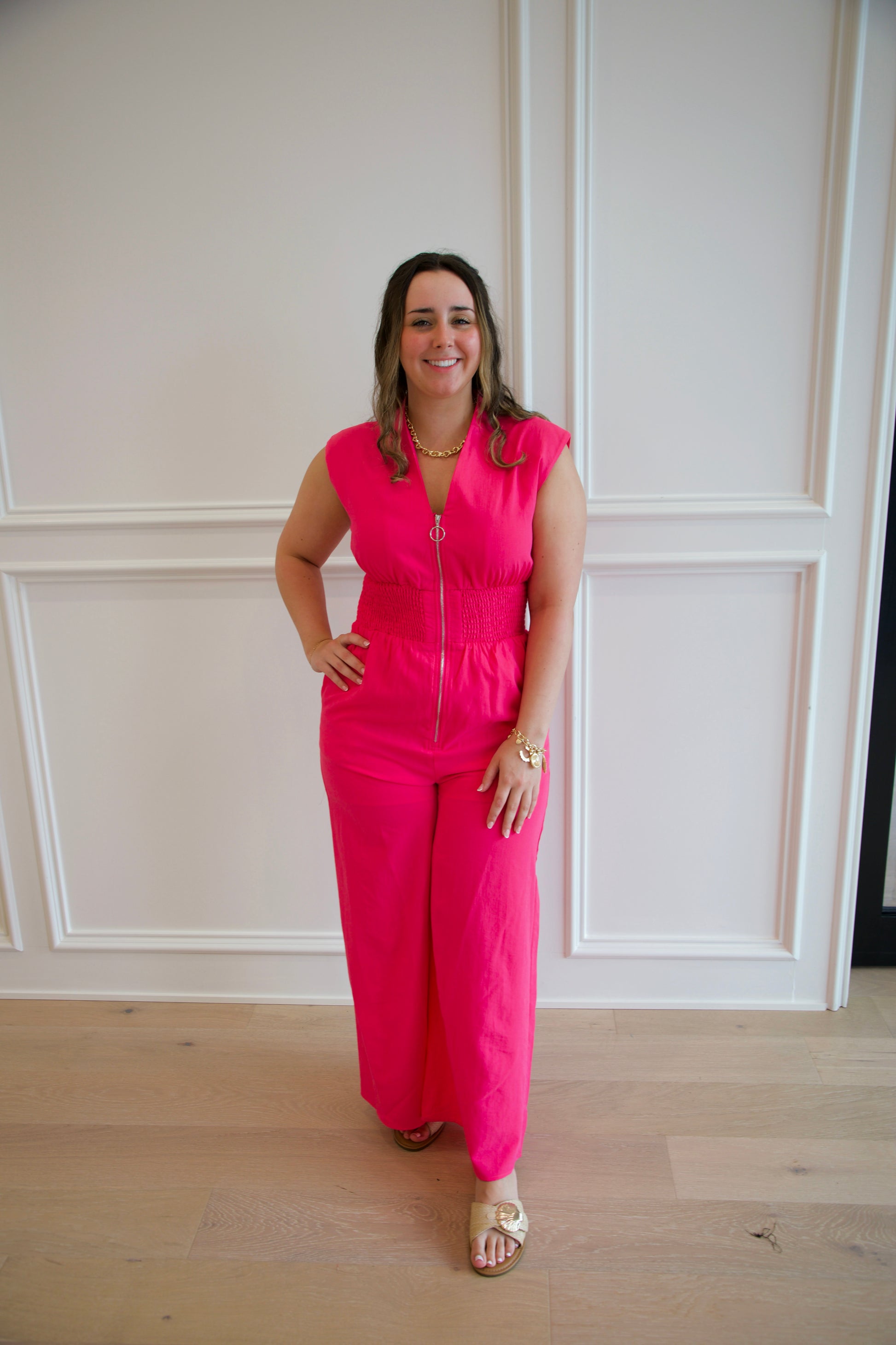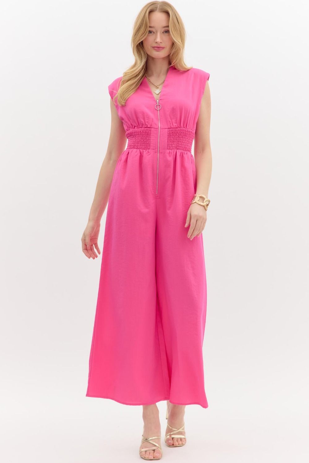 Solid v-neck sleeveless wide leg jumpsuit featuring zipper closure at front. Smocking at waist. Pocket at sides. Lined. Woven. Non-sheer. Lightweight.