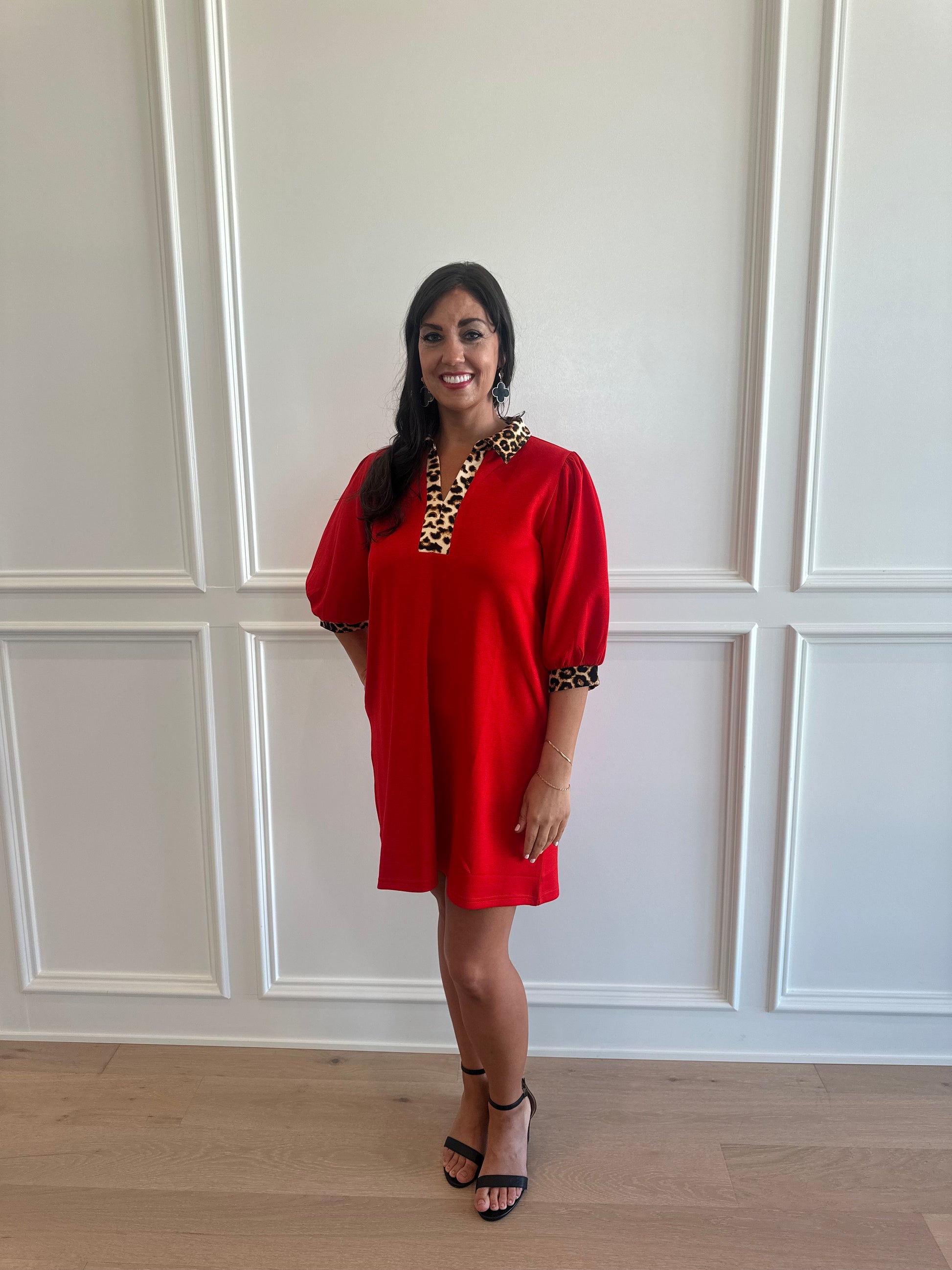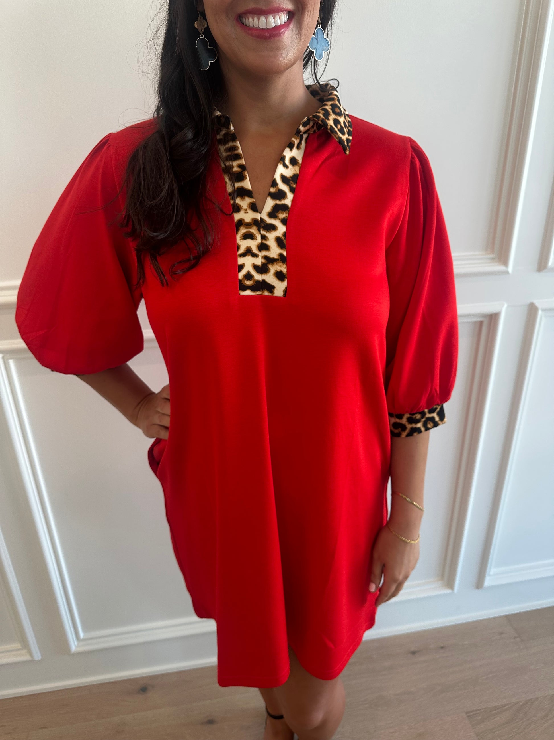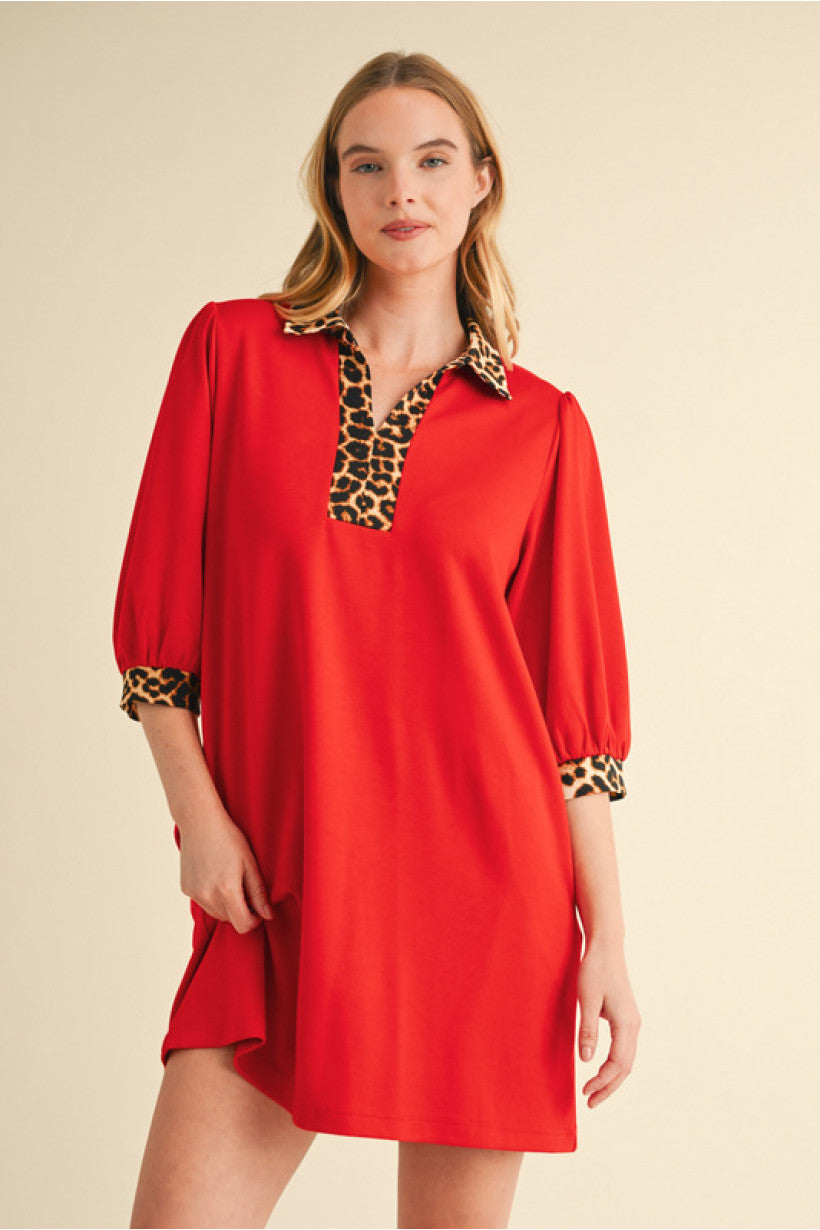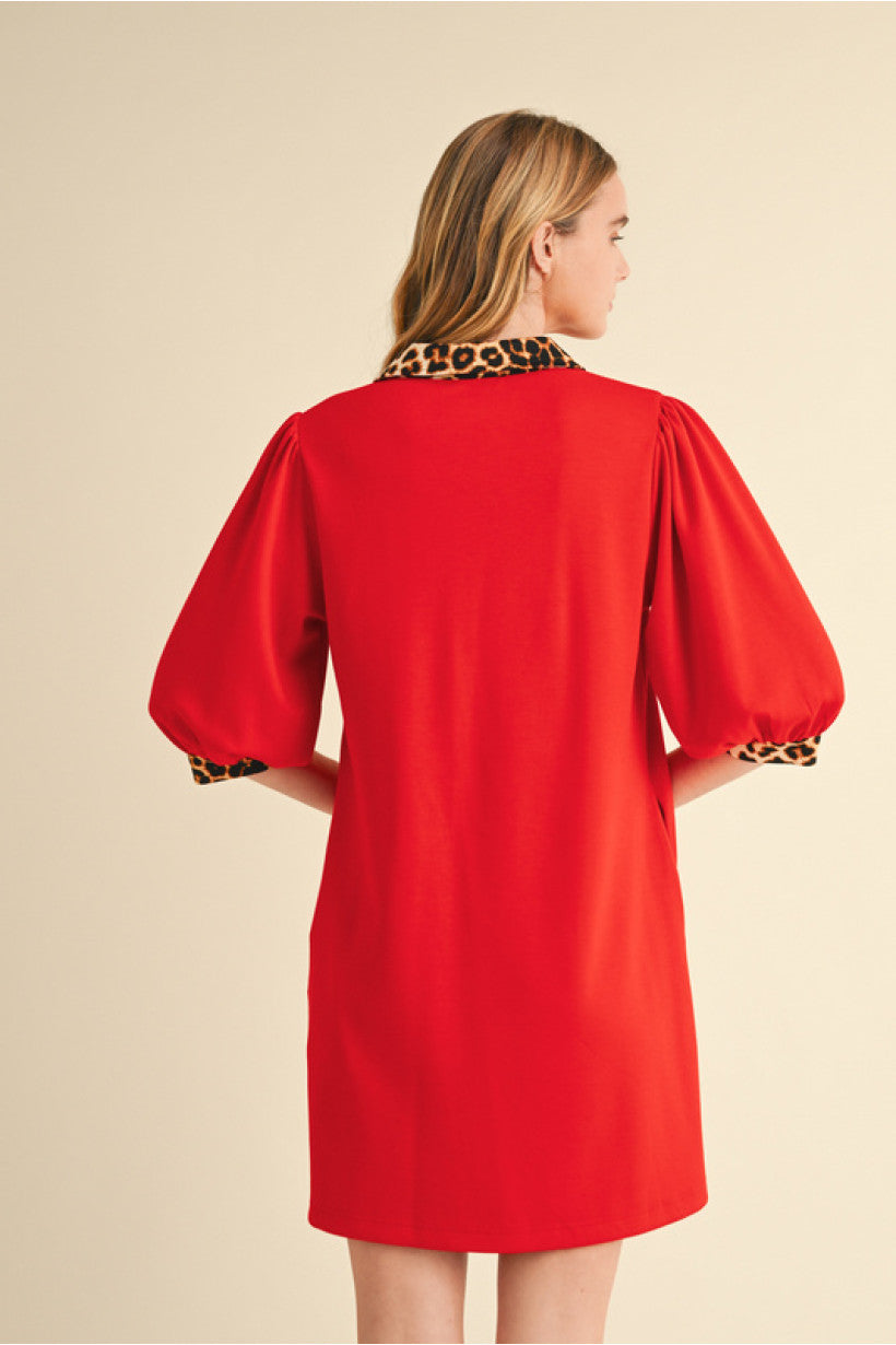 Solid dress with open collared neck, puffed three quarter sleeves, side pockets, leopard print at the sleeve ends and neckline.