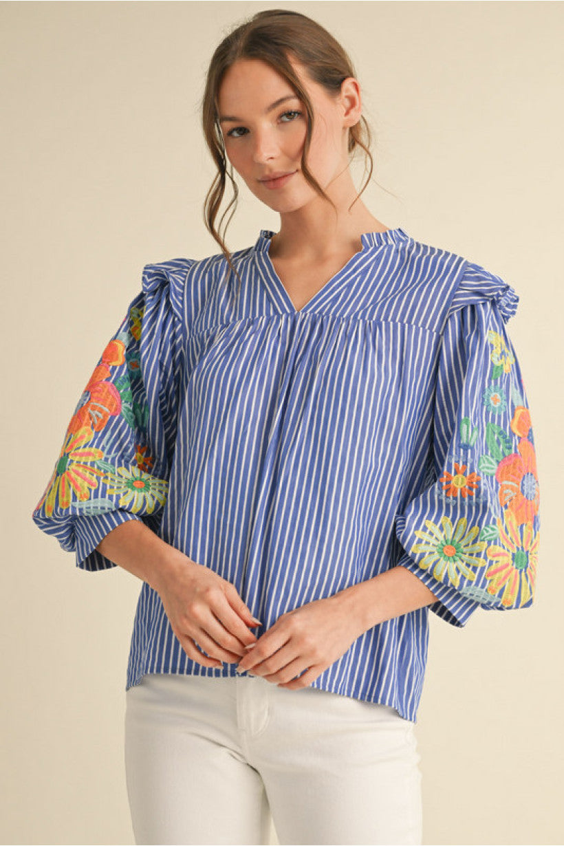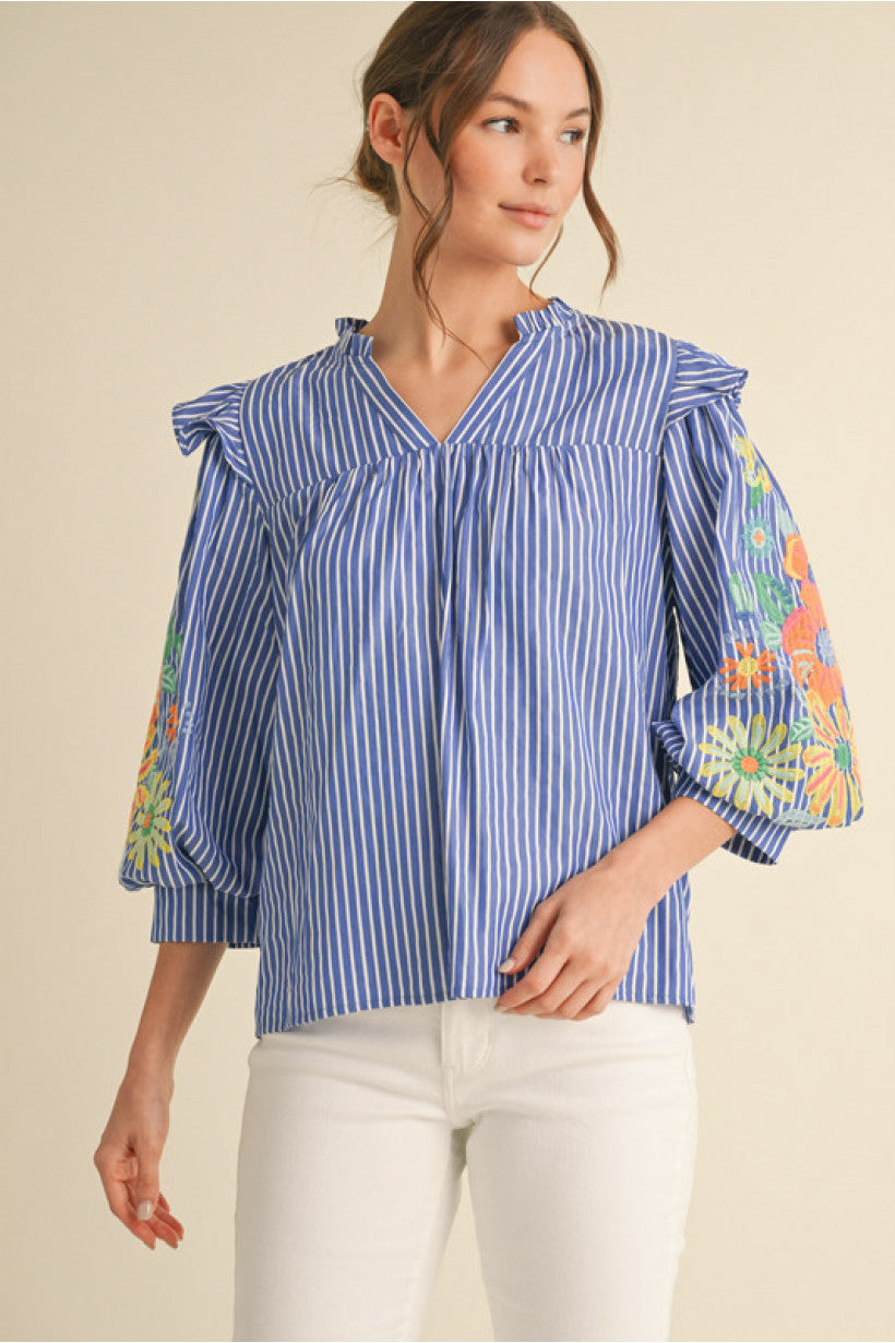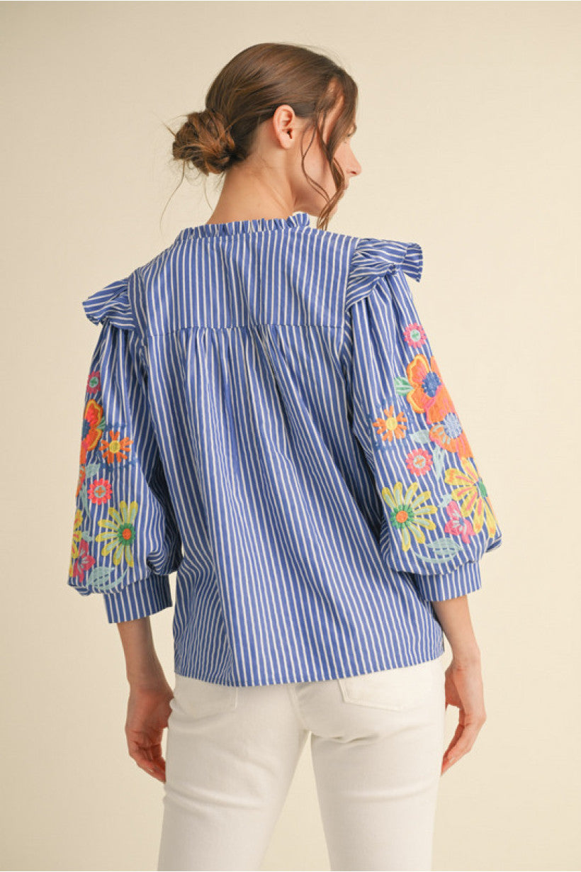 Denim striped embroidery top with slit frilled neck, shirring yoke, ruffly trimming shoulder, three quarter peasant sleeves featuring flower embroidered, and band cuffs.