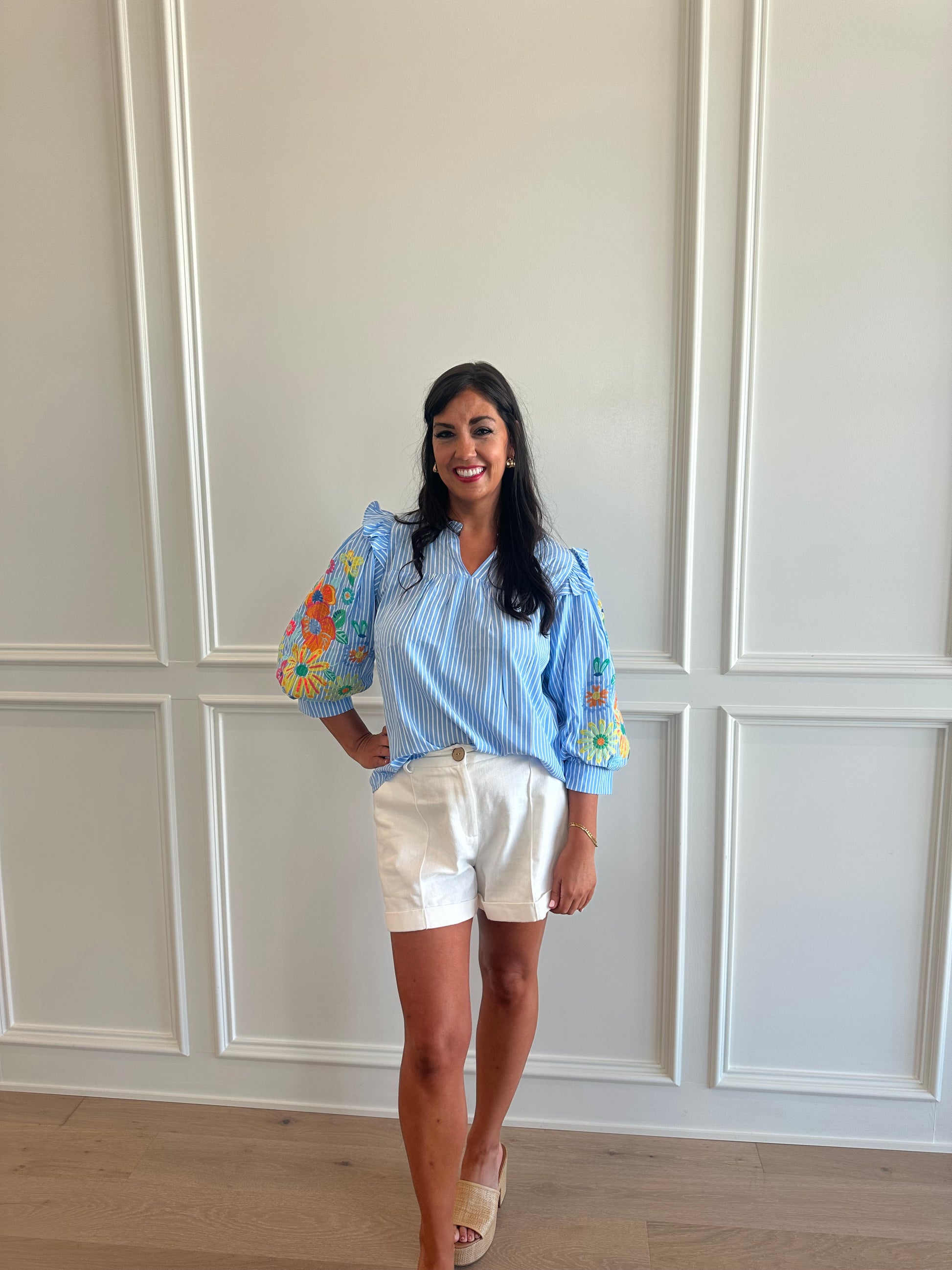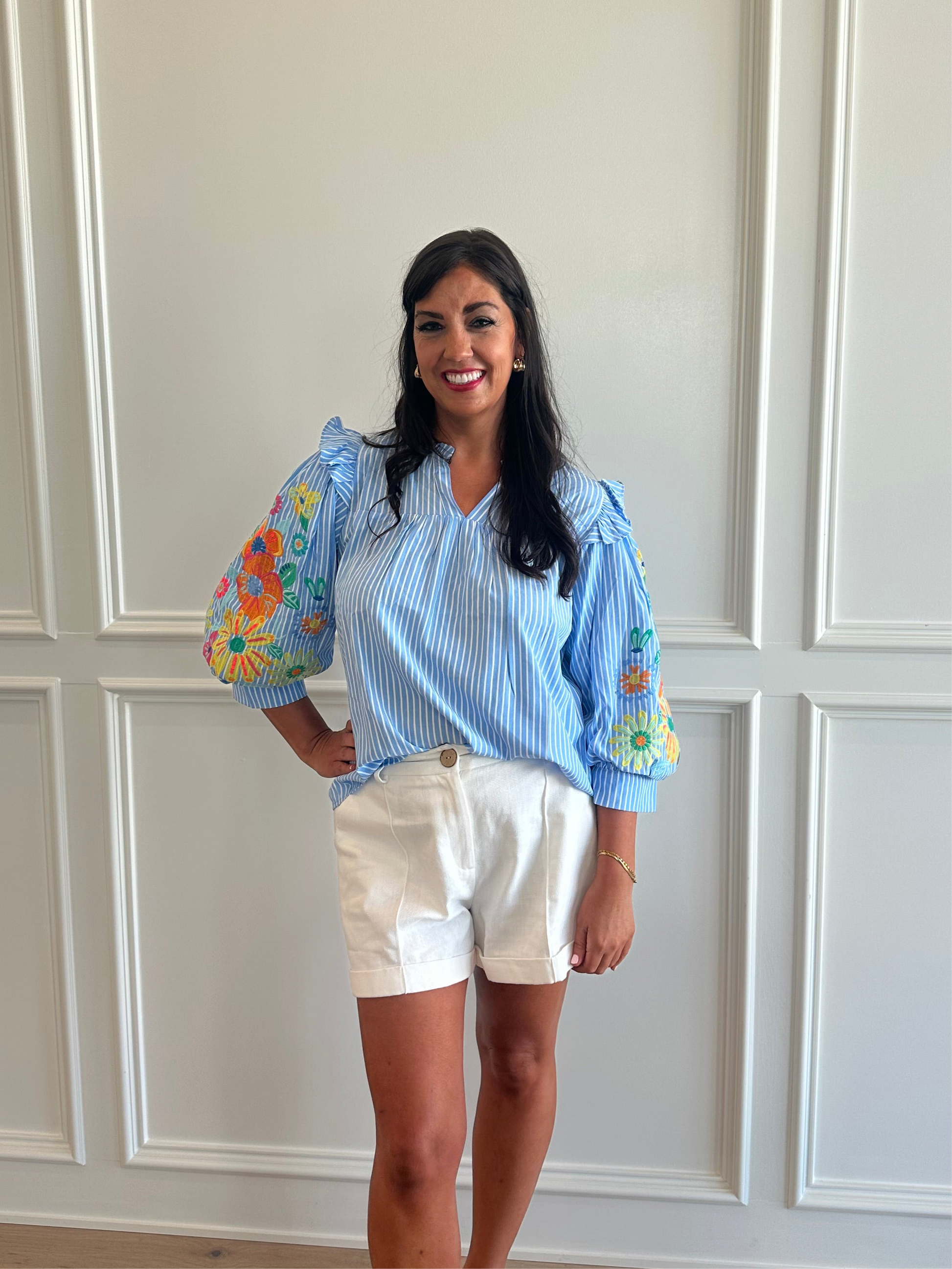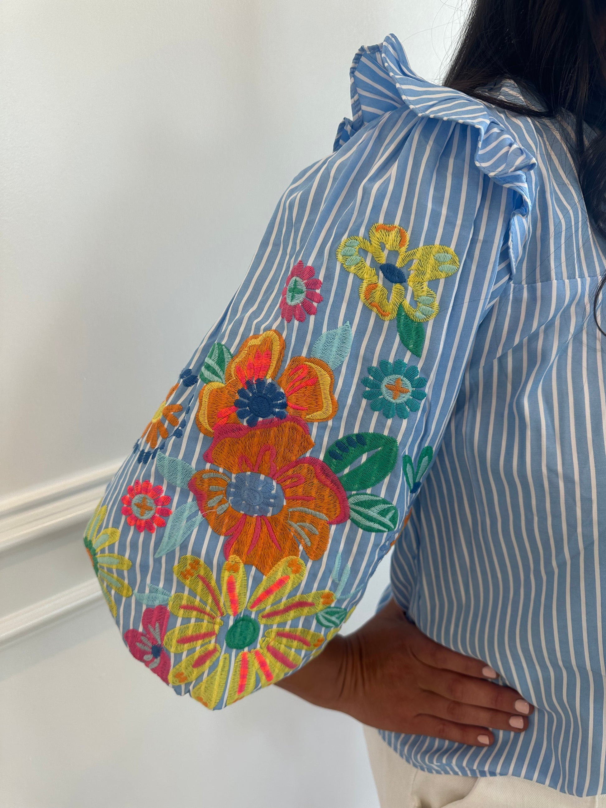 Denim striped embroidery top with slit frilled neck, shirring yoke, ruffly trimming shoulder, three quarter peasant sleeves featuring flower embroidered, and band cuffs.