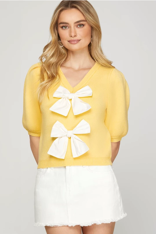 Elevate your style with our Stay Sweet Sweater Top in yellow. The short puff sleeves add a playful touch, while the delicate white bows add a subtle feminine flair. This sweater top is the perfect addition to your wardrobe, providing a pop of color and charm to any outfit.